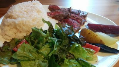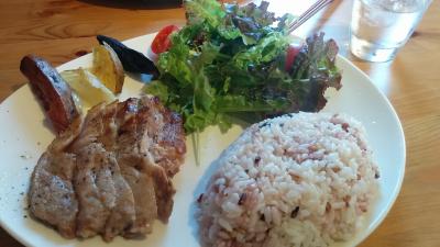 「真狩村ハーブ豚グリルプレート」(1200円)と「ふらの和牛と野菜のグリルプレート」(1500円)をふたりでシェアしました。スープ、ドリンク付きです。ごはんは白米or十六穀米を選べます。