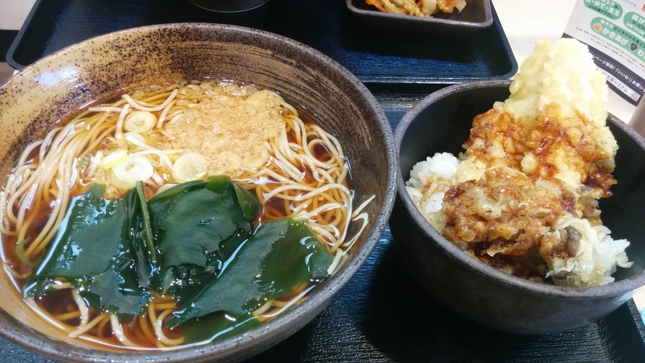 「かき揚げそば」と「とり舞茸天丼セット」を注文し、ふたりでシェアしました。
