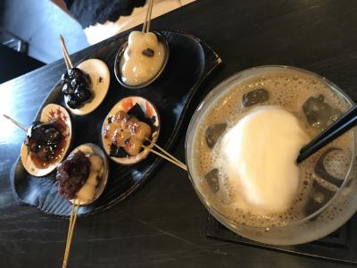 ままごとセットのような可愛らしい炙り団子は想像通りモチモチしていて、優しい白みそ味がほっこり、まったりさせてくれます。