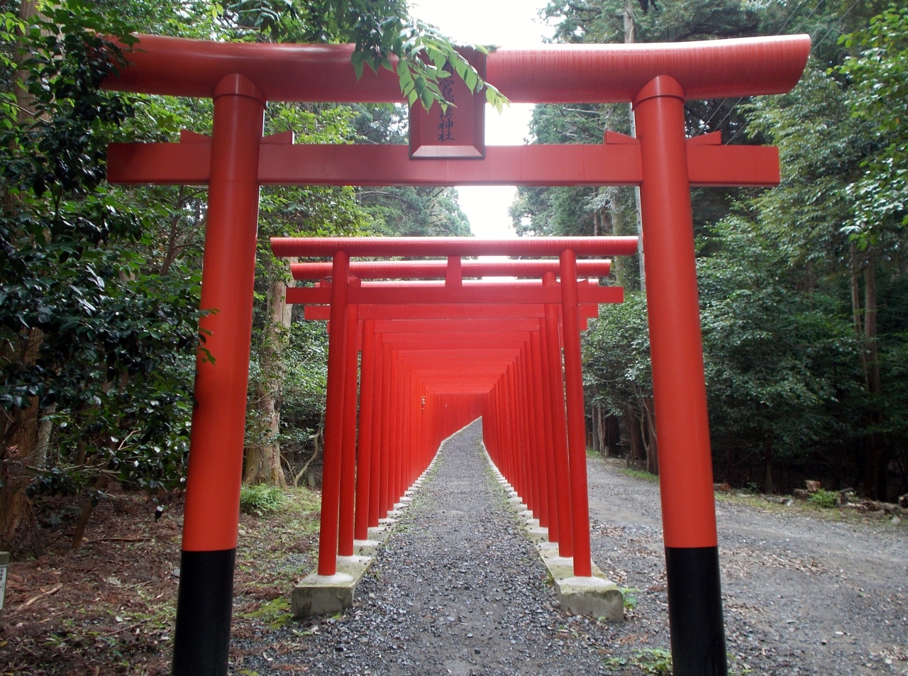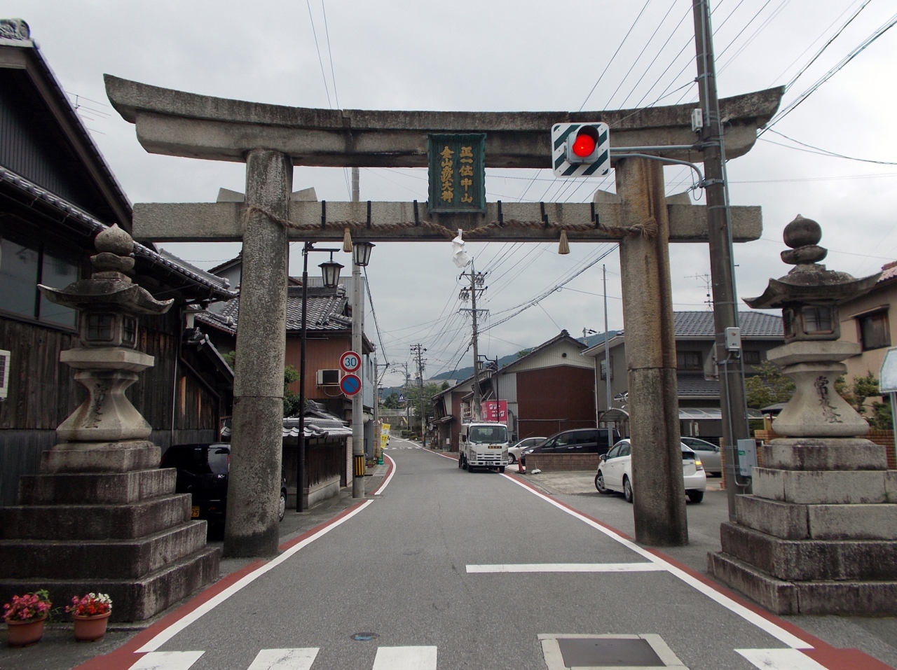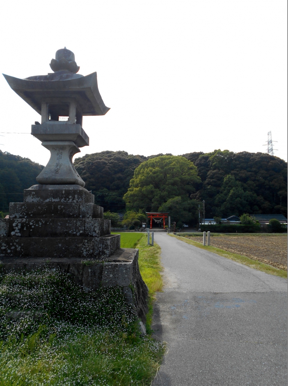 岡崎市内国道1号線舞木町西交差点を曲がると、正面に「山中御宮」と銘打ちされた石燈籠があり、右手に朱塗の鳥居と社叢が見えます。