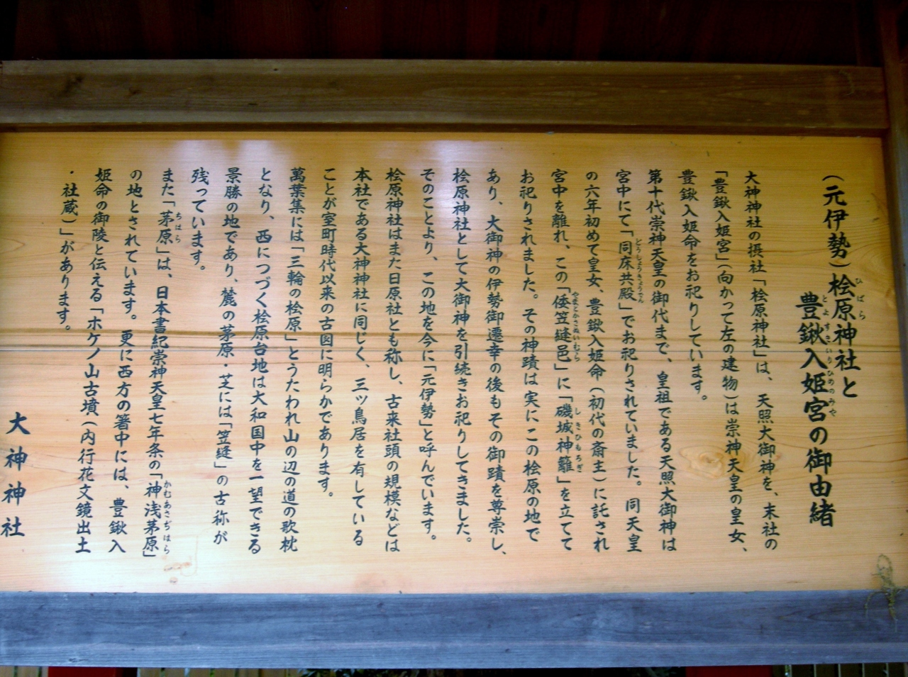 天照大御神が宮中を離れこの地に祀られた後、大御神の伊勢御神幸の後も引き続きお祀りしている神社である旨、説明書きにありました。そのことから檜原神社は「元伊勢」と現在もなお親しまれているようです。