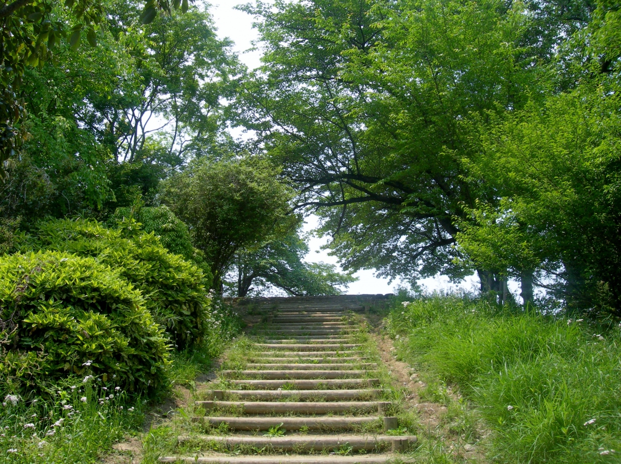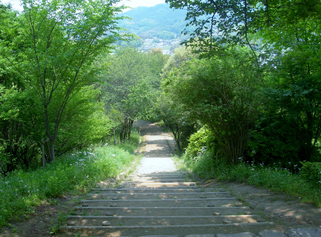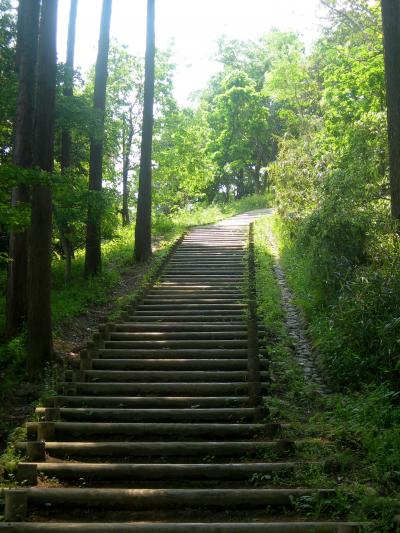 新緑の生い茂る丸太の階段を登った先に見晴しの良い展望台があります。