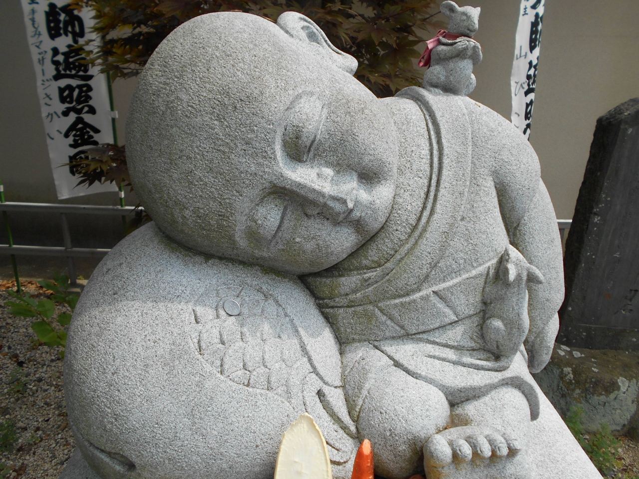 参道左手にはダルマが奉納された宝篋印塔、稚児大師像、金比羅大権現堂があります。