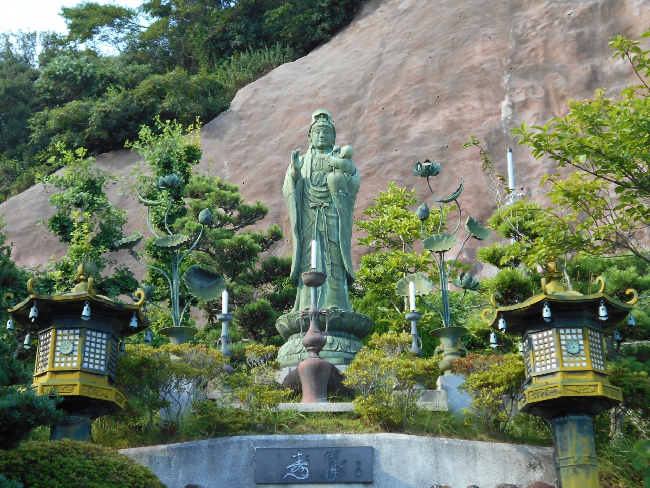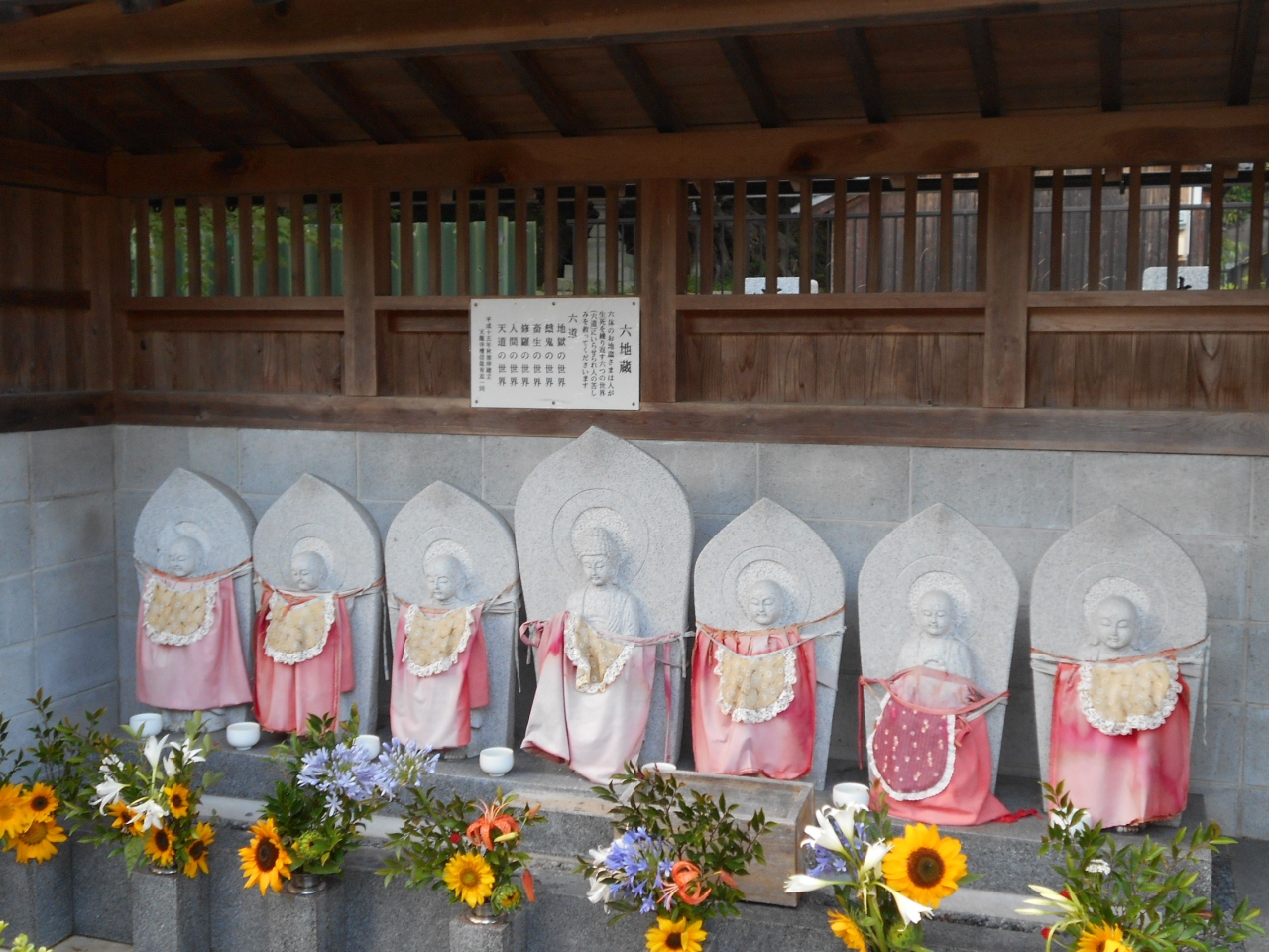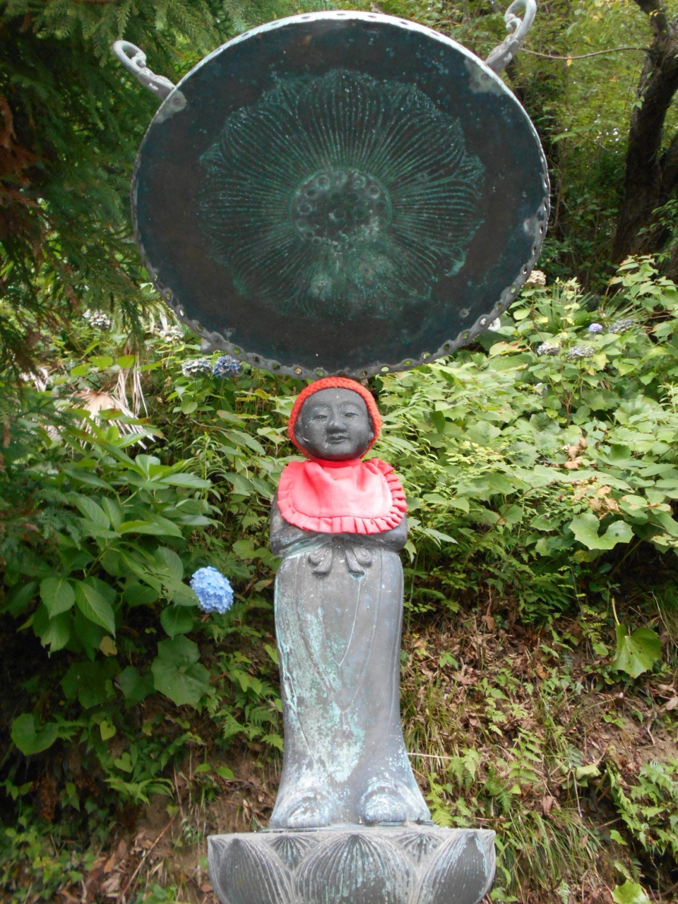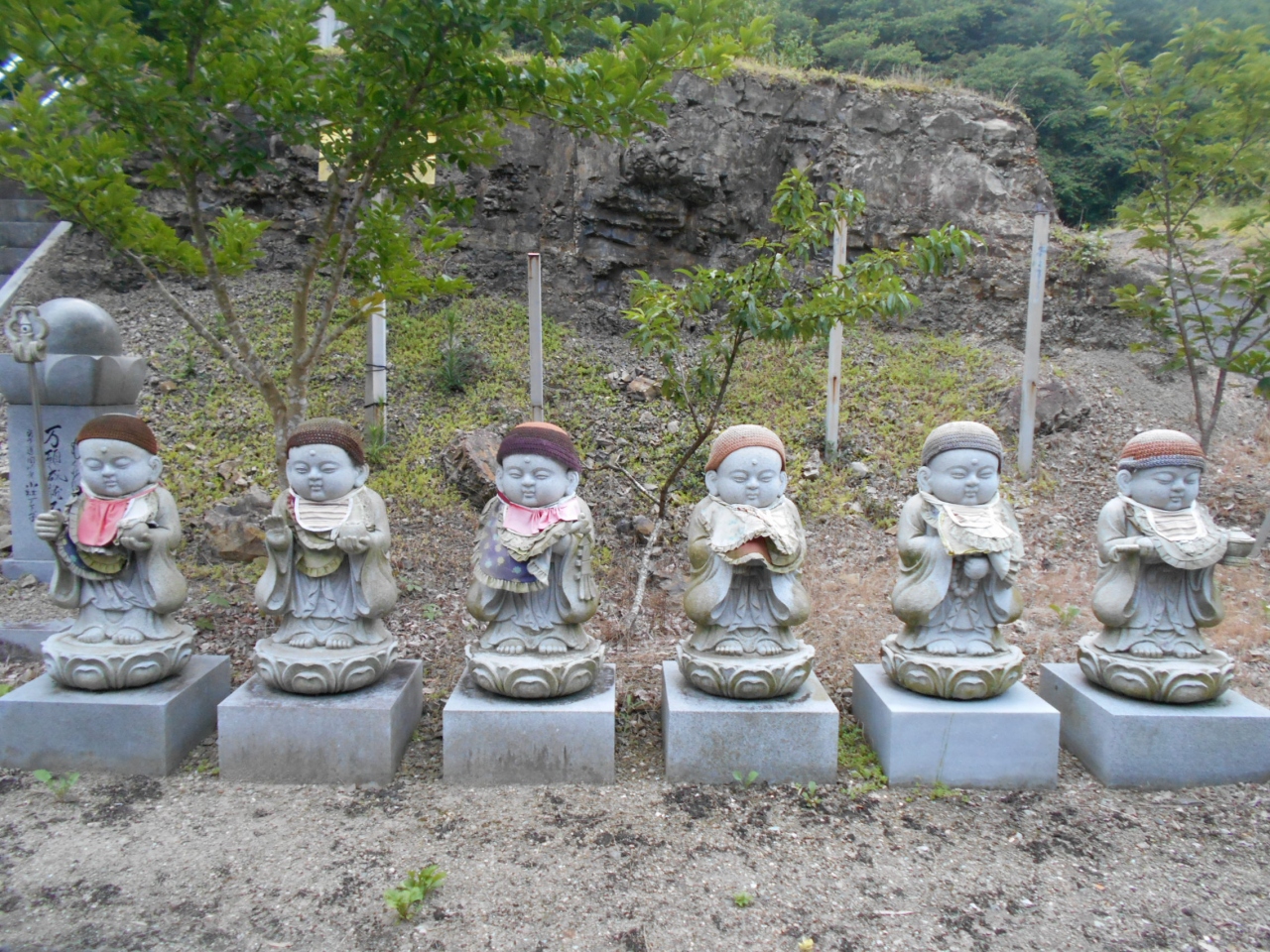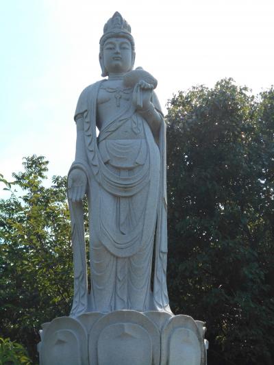 車を降りてまず目を引くのが、麓の可愛らしい表情の六地蔵さまと丘の上の木蓮観音立像です。ここを拝観できたらもういっか、って思うくらい立派な観音様とお地蔵様。