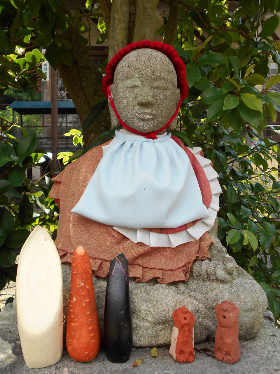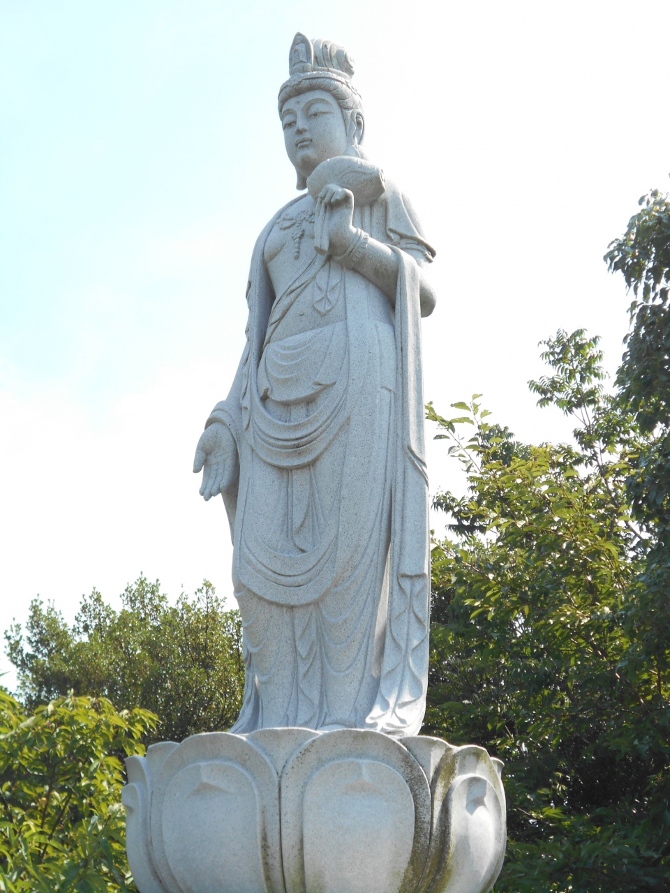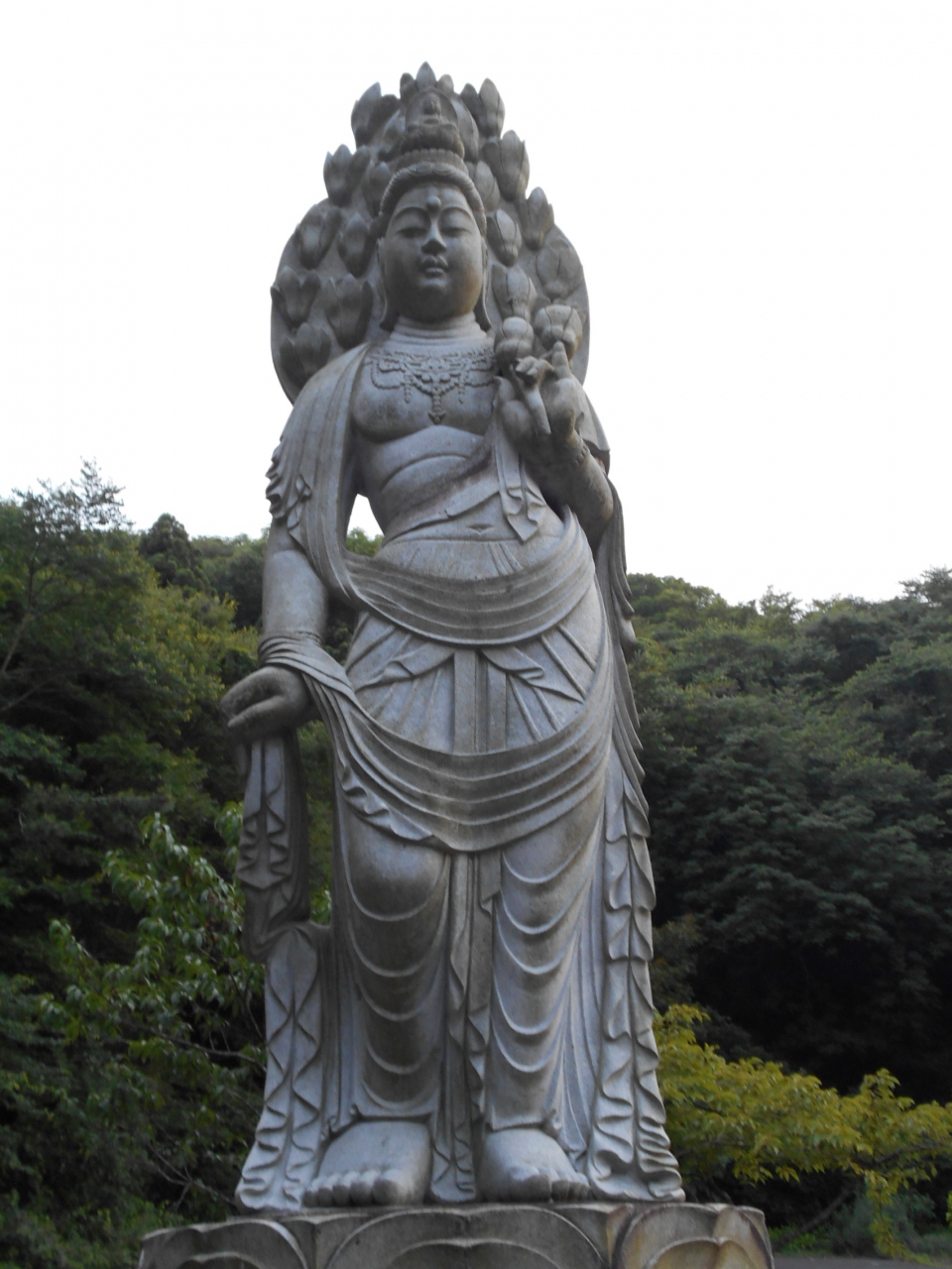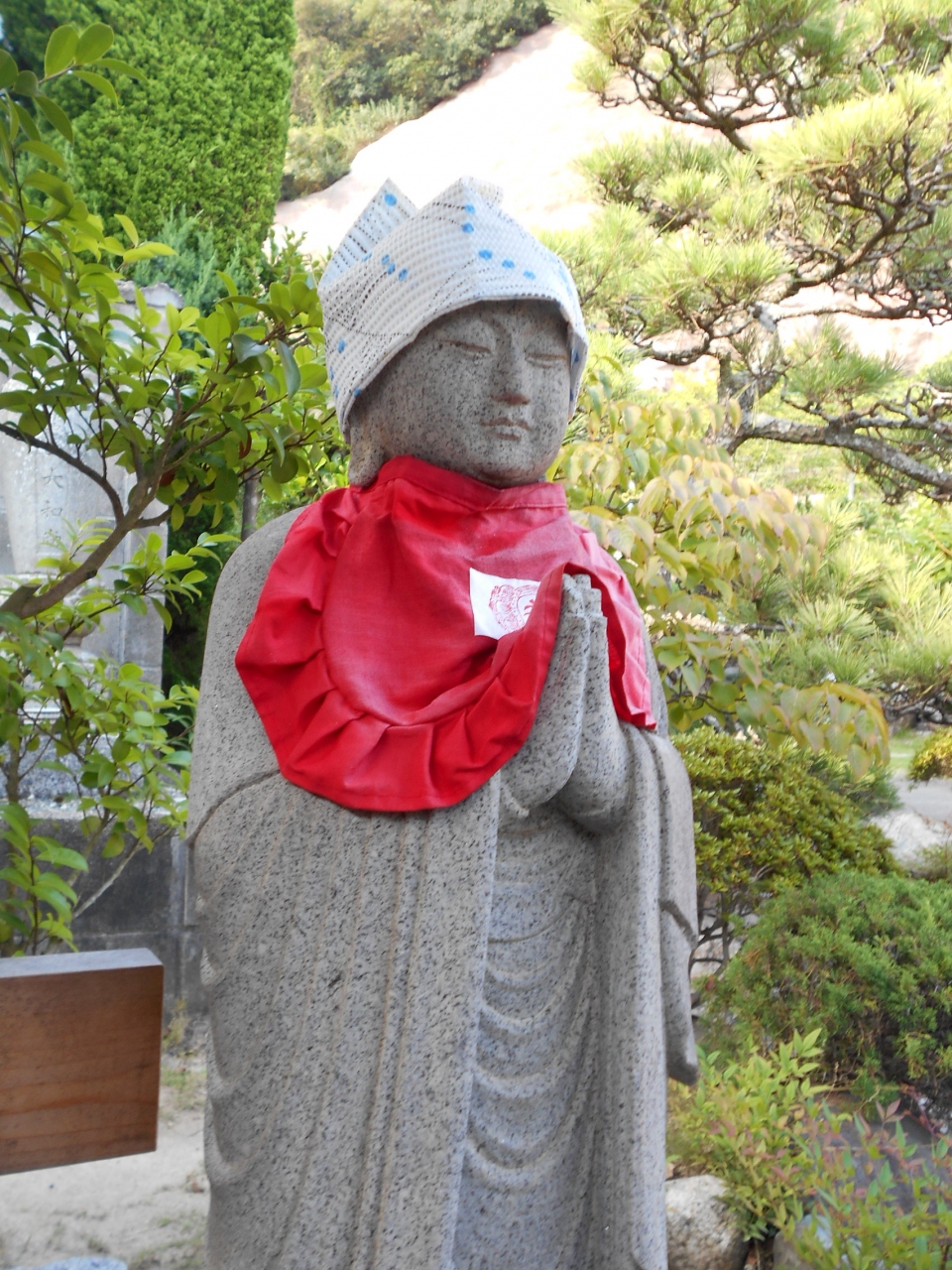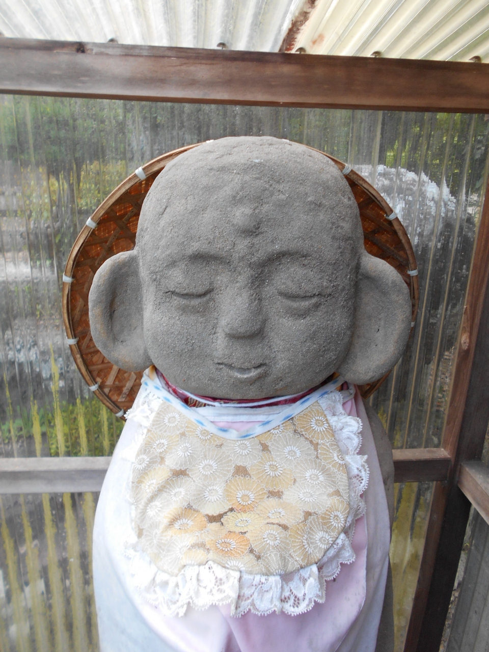 車を降りてまず目を引くのが、麓の可愛らしい表情の六地蔵さまと丘の上の木蓮観音立像です。ここを拝観できたらもういっか、って思うくらい立派な観音様とお地蔵様。