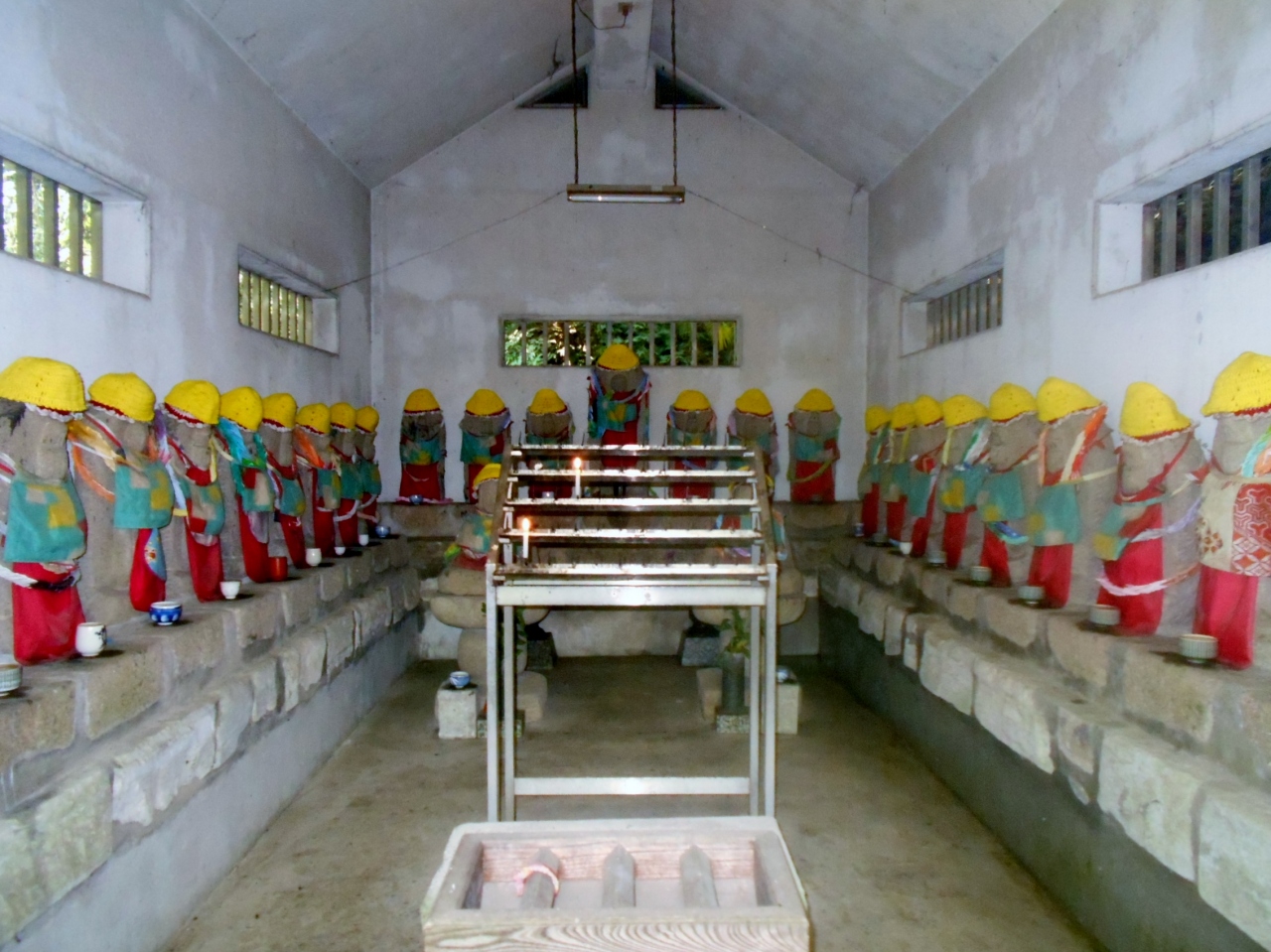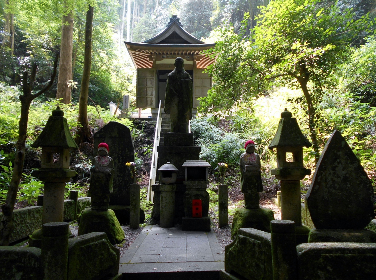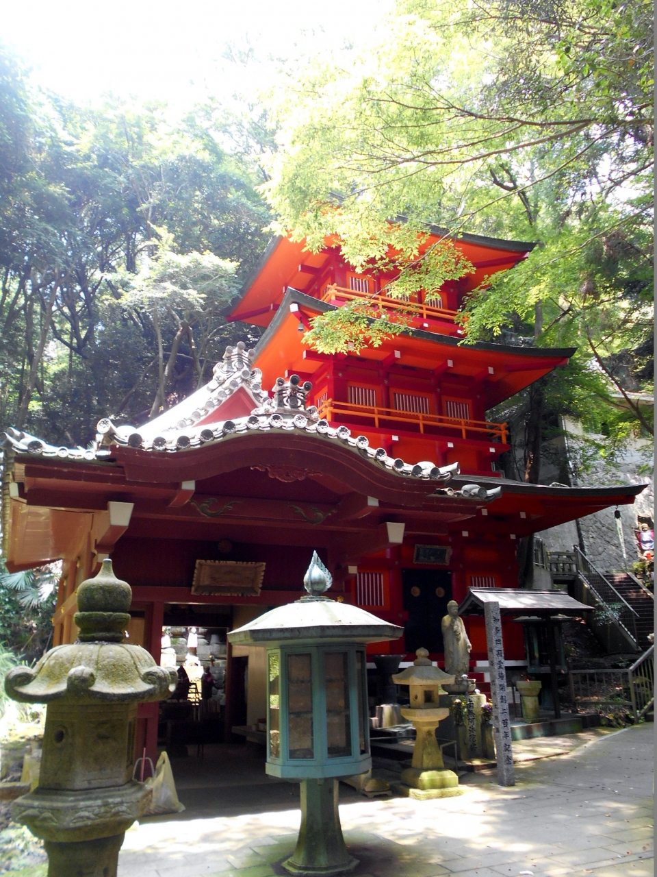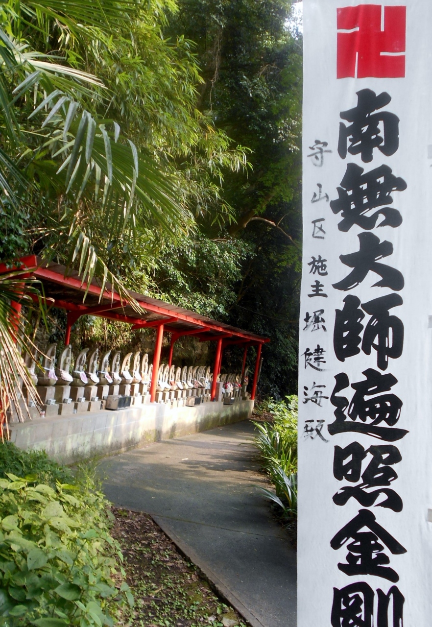 南知多町の仏閣めぐりで訪れた、知多四国八十八箇所番外札所、尾張高野山宗総本山岩屋寺の奥の院です。岩屋寺から東へ300mほど進むと入口があり、六地蔵・開山堂を過ぎるとド派手な真赤の三重塔があります。その対面に知多半島くるま六地蔵霊場の御堂があり、ここから石段参道を上ると右手に女人堂・左手に妙浄上人坐像・奥ノ院本堂・身代大師像・二十五菩薩堂があります。拝観どころたくさんの霊場ですが、夏は蚊が多いので虫よけスプレーが欠かせません。