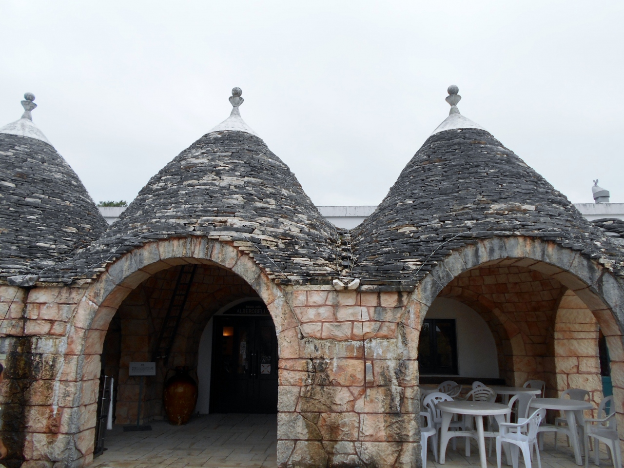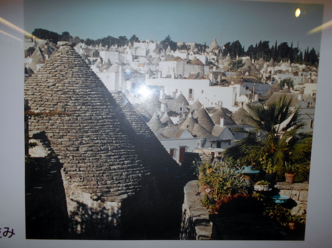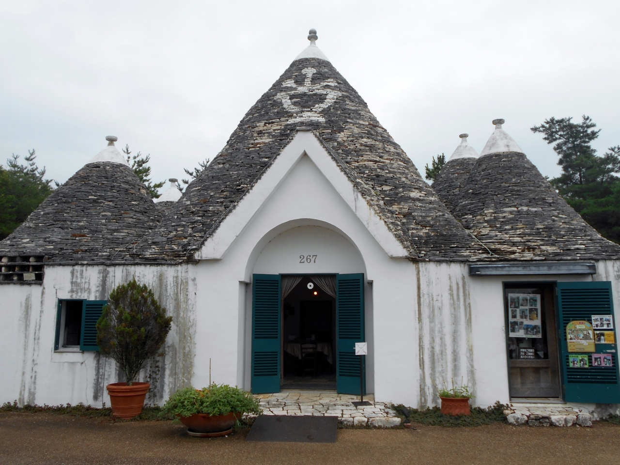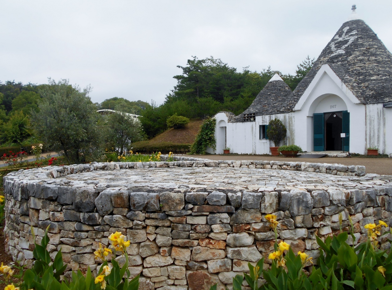 愛知県犬山市リトルワールドのゾーン?、イタリア アルベロベッロの家の左手にあります。白漆喰の母屋・右手の納屋・奥の小屋と3棟の建築物があり、母屋内部は常設展示を観ることができます。