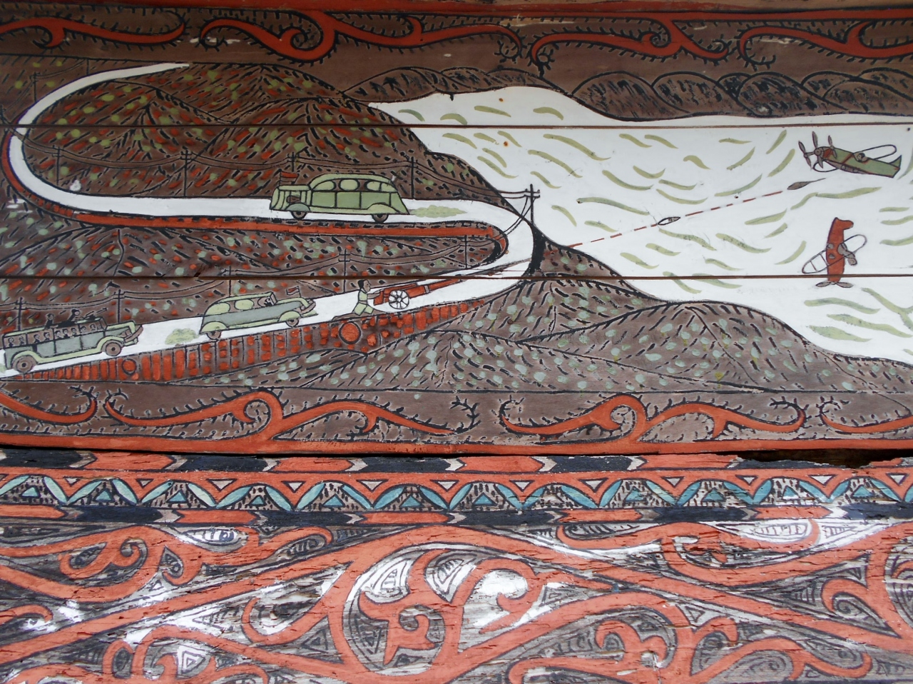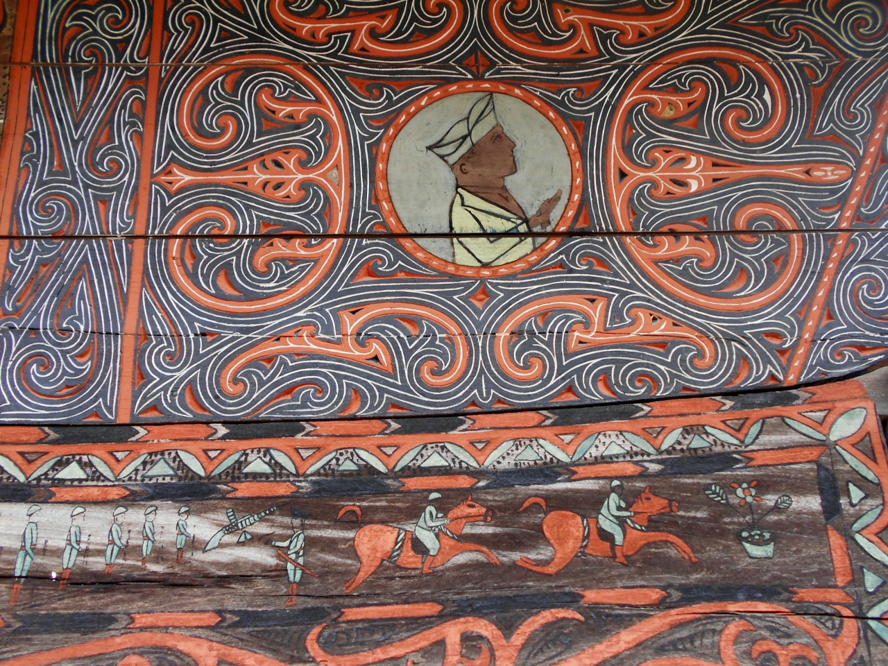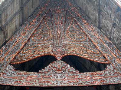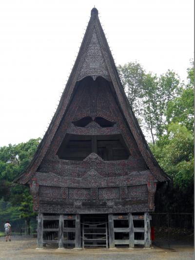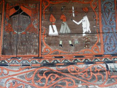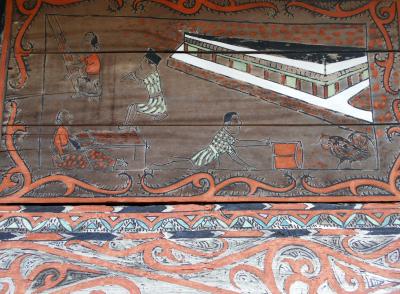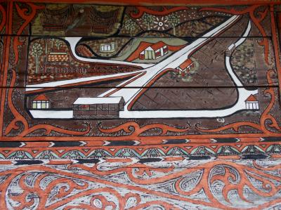 建築物の外観しか観ることはできませんが、船の形のような大きな高床式の家は見事です。正面の壁・横壁に色々な装飾画・絵画が描かれているのでじっくり観たいところ。