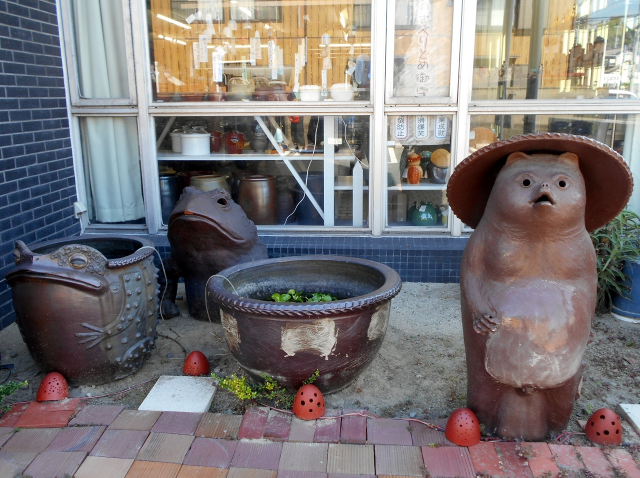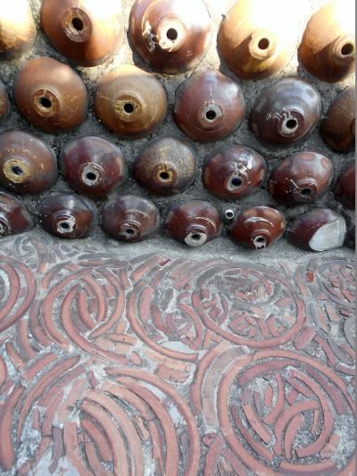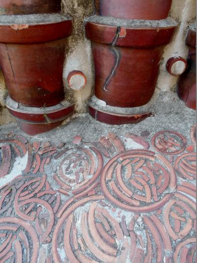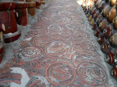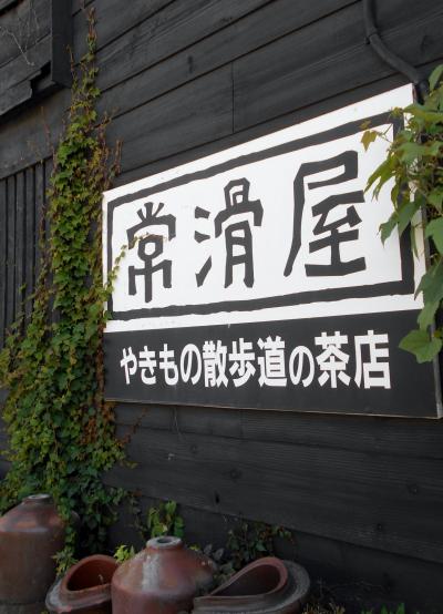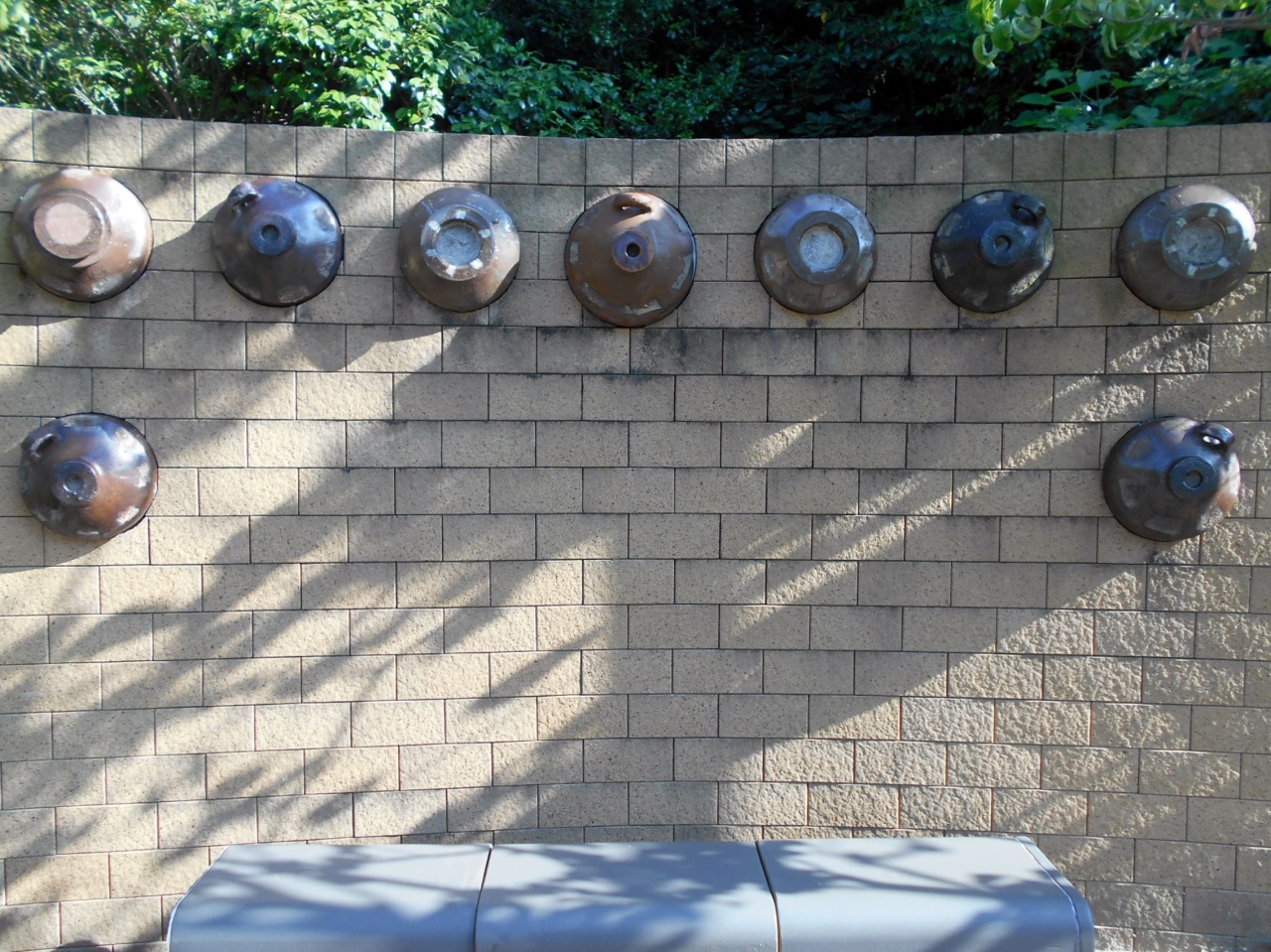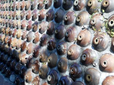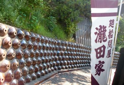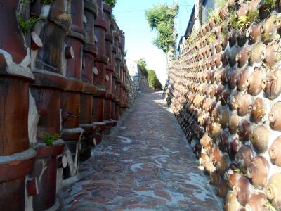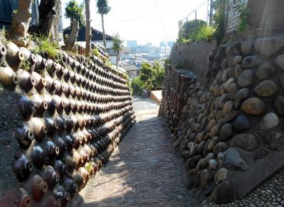 ここを観なけりゃやきもの散歩道を訪れた意味がない、というくらい定番中の定番スポットです。説明書きにありましたが、土管坂の左側には明治時代の土管・右側には昭和初期の焼酎瓶が埋め込まれており、路面には「ケサワ」という土管の焼成時に下に置く焼台が敷かれています。まさしく「やきもの尽くし」の散策路です。