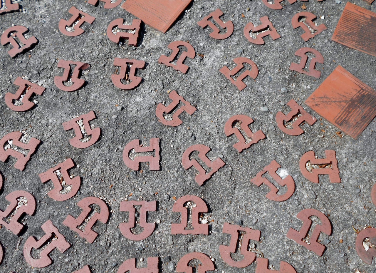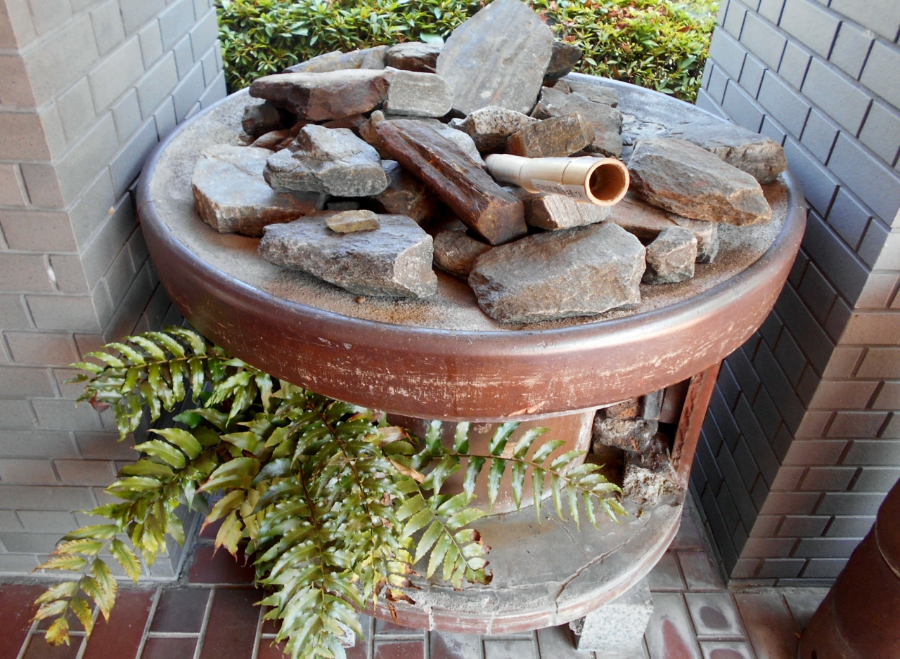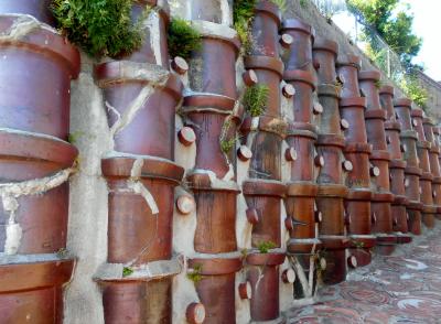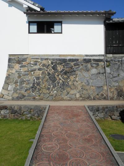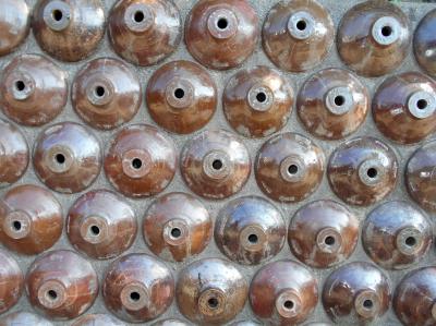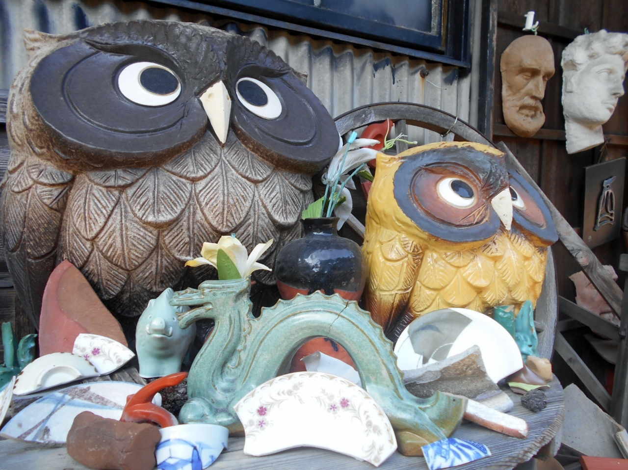 ここを観なけりゃやきもの散歩道を訪れた意味がない、というくらい定番中の定番スポットです。説明書きにありましたが、土管坂の左側には明治時代の土管・右側には昭和初期の焼酎瓶が埋め込まれており、路面には「ケサワ」という土管の焼成時に下に置く焼台が敷かれています。まさしく「やきもの尽くし」の散策路です。