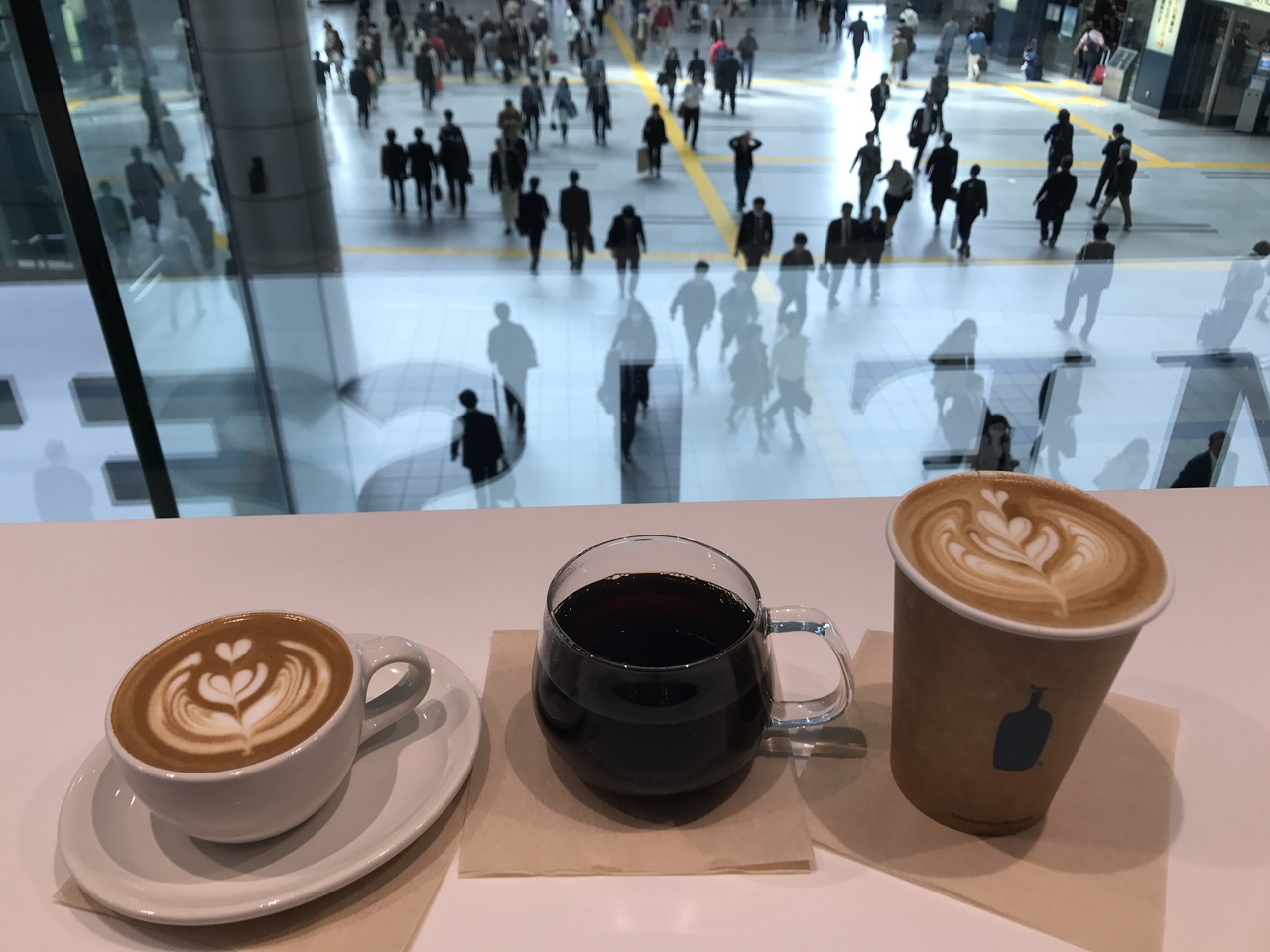 品川駅のコンコースを見下ろす位置にあるブルーボトルコーヒー。いつも数名並んでいる状態ですが、カウンター席ならタイミング次第ですぐに座れるかも。行き交う人々をガラス越しに眺めながら、一杯のコーヒーで一息つくのにぴったりの場所です。