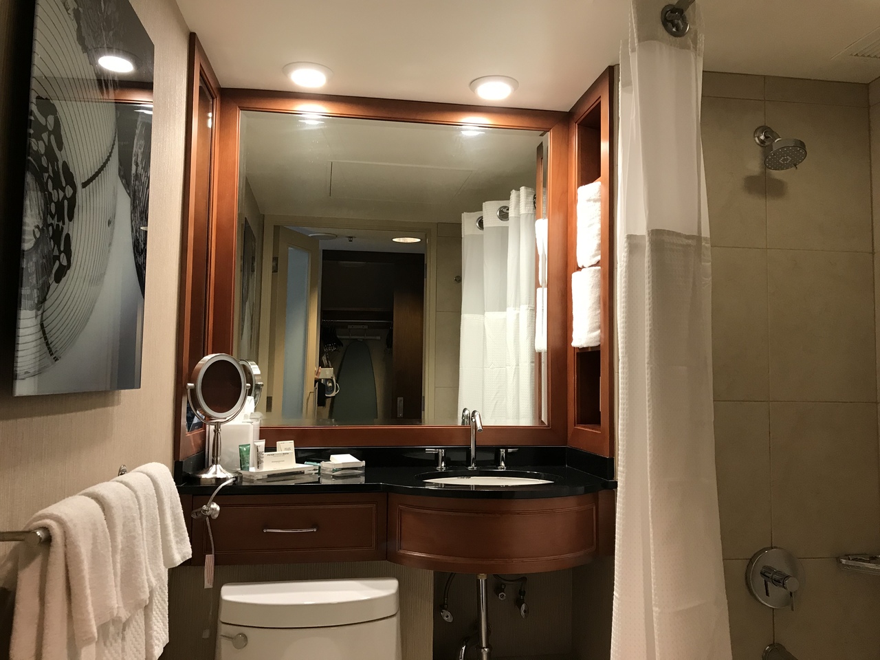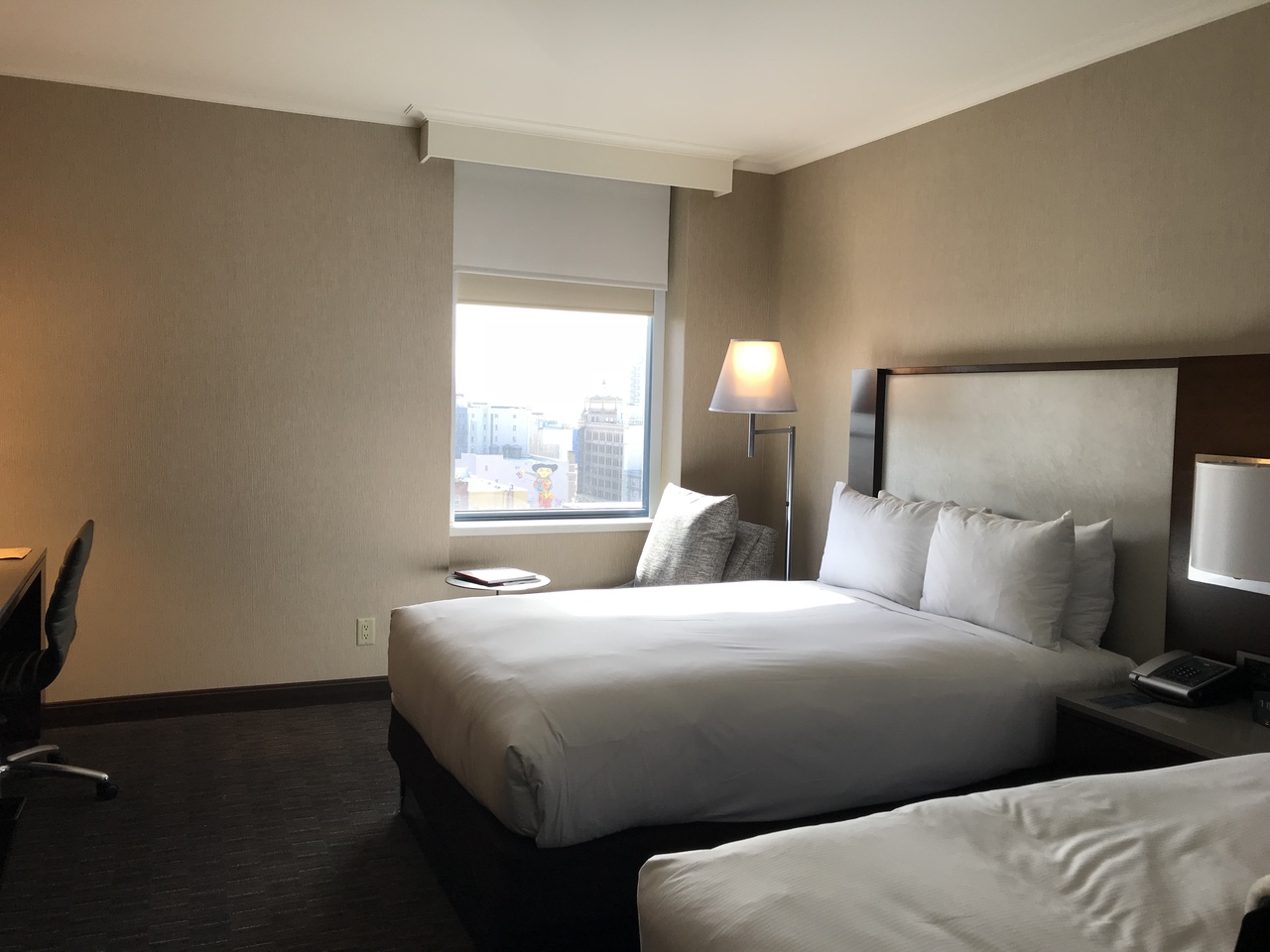 親子二人で宿泊しました。眺めは良くありませんが、2つの大きなベッドがある部屋を案内してもらいました。ケーブルカーのPowell~Hyde線の停留所にも、Walgreensにも、Bartの駅やMuniバス停にも、パンケーキの朝食のお店が多いユニオンスクエアにも近く、とにかく立地が良かったです。巨大なホテルの割には車寄せが小さいですが、タクシーが2台ほど常駐しており、係の方に告げるとすぐに乗せてもらえました。ヒルトンオナーズに入会(無料)すると、wi-fiも無料で使えます。