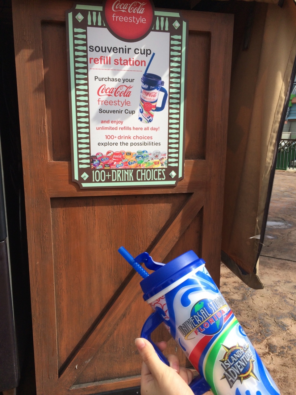 ユニバーサル・スタジオに着いたらまず、2つのパークで共通に使えるスーベニア・カップの購入をお勧めします。これは、記念にもなるプラスチック・カップ入りのドリンクで(購入時に好きなドリンクを入れてもらえます)、最初は13.84ドルかかりますが、飲み放題なので3~4杯のおかわりで元が取れると思います。2杯目からは、園内にいくつか設置されたリフィル・ステーションで、100種類以上のドリンクから選んで、好きなだけ何度も入れることができます。水も選択できますので、カップをゆすいで違う味のドリンクを入れたりもしました。