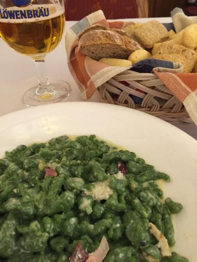 後日再訪、日本語メニューもあり郷土料理シュペッツル・ほうれん草のクリームパスタを頂く、これもまた旨し、ビールとワインが弾む。