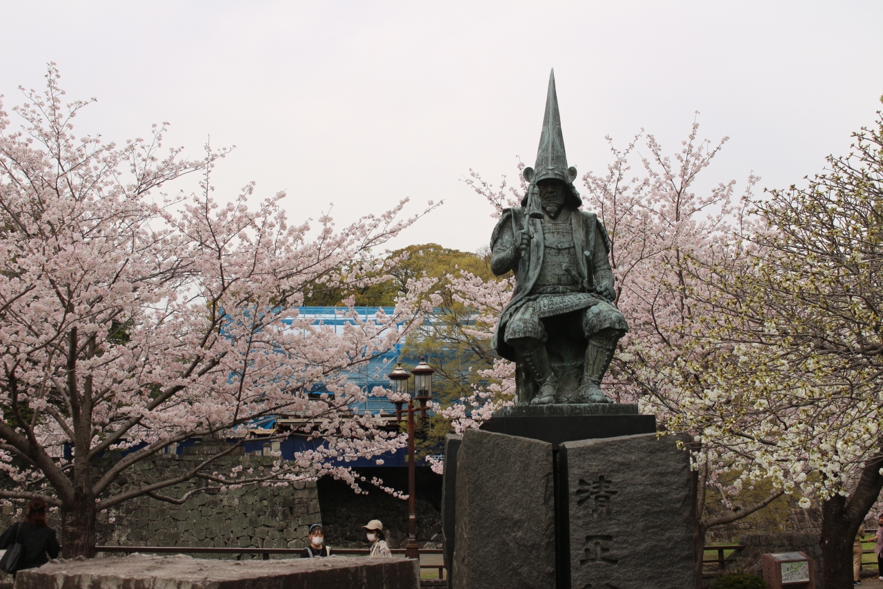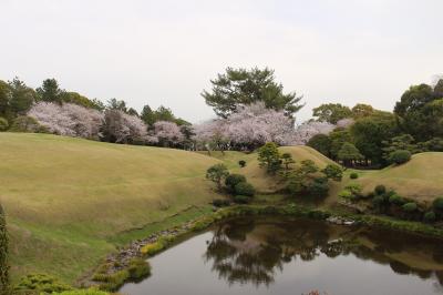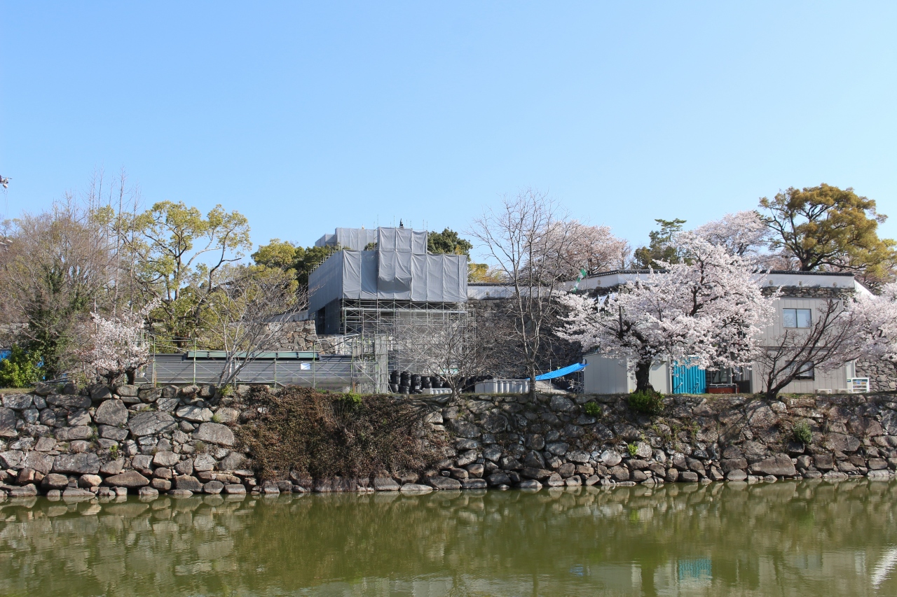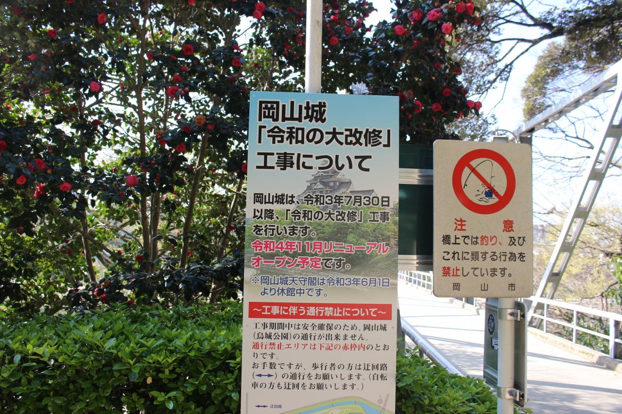 後楽園からその存在を確認できなかったのですが、後楽園を出て城へ向かうとちょうど改修工事中で幕に覆われていることを知りました。その後も周囲を散策しましたが、近づくことができず残念でした。桜は少しだけ周囲にある感じでした。