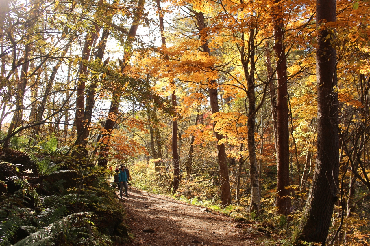 毘沙門沼に辺りはアスファルトの道ですが、ほとんどの道はゴツゴツした岩も露出した遊歩道ですので、運動靴がよいと思います。約4㎞、片道1時間20分くらいですが、マイカーの場合往復しないといけないので結構時間もかかるし体力も必要です。