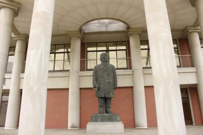 青淵公園の桜を散策した際、渋沢栄一記念館の裏側に銅像がありました。裏側からも入れて館内の見学ができました。ブラタモリ訪問の写真パネルもありました。アンドロイドの案内だけ有料となっていました。バスケットコートもあって不思議な空間でした。