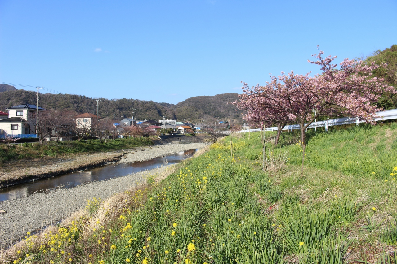 保田川沿いに早咲きの河津桜(頼朝桜)が植えられています。