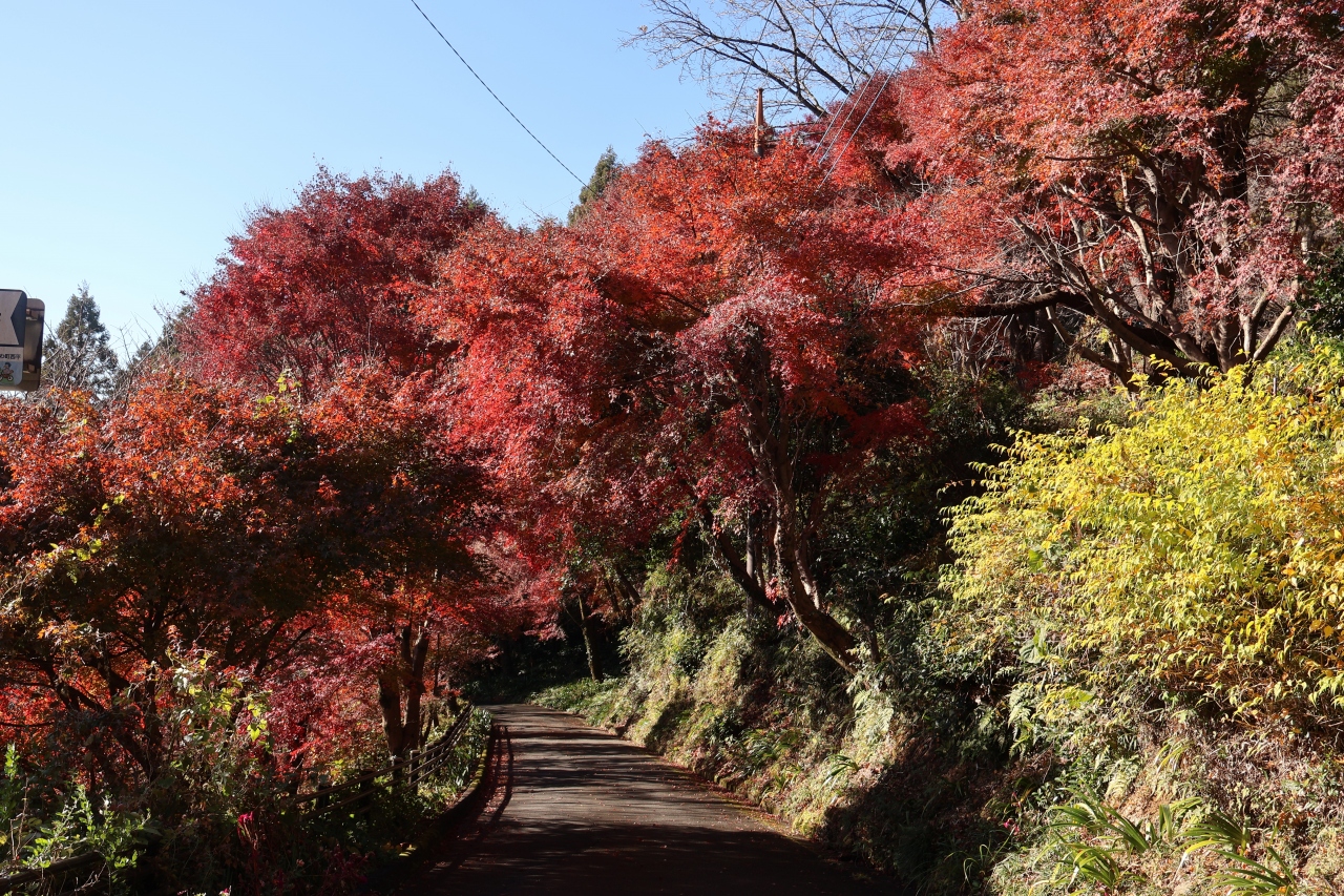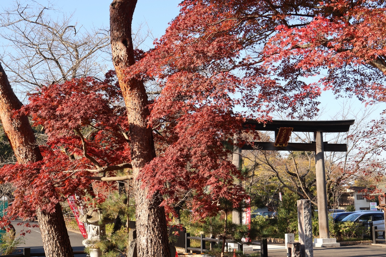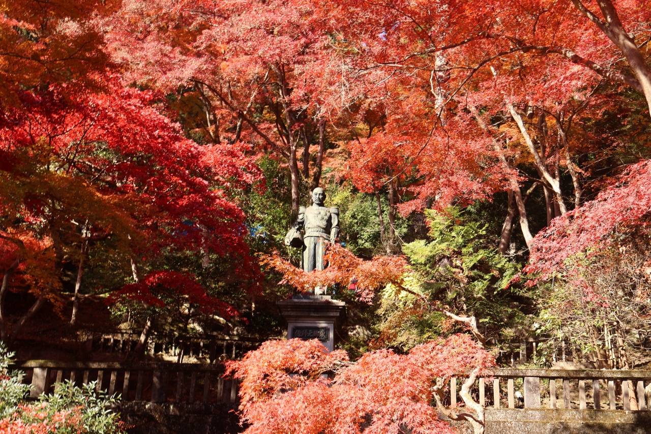 紅葉の名所として紹介されていて、今回、割りと近い場所に行く機会があったので少し遠回りして行ってみました。駐車場に車を止め坂道、階段を山の上の神社に向かって歩いていくと途中に東郷さんの銅像があってこの周りが紅葉だらけでした。もっと上まで道は続いていてラスボス的に長い階段があって、出来たら上に行って自分の目で確認したかったけど、この先は自分には無理と思って引き返しましたが、紅葉は十分満喫できたのでよかったです。