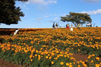 新幹線の駅の脇にある感じ、自宅からそう遠くないですが、割りと最近知った公園で、カーナビで出てこず、スマホのナビで到着したのは丘の下の小さな駐車場、近づいても案内表示もなかったですがそこから丘の上に歩いていくと、広い駐車場とトイレがありました。車で再度行きました。丘の上で群馬の山の見晴らしがよく、マリーゴールド初めて知りました。きれいでした。日曜のためか駐車場は満車近くで来場者も多数、まだ蕾もあったがなかなかの見応えでした