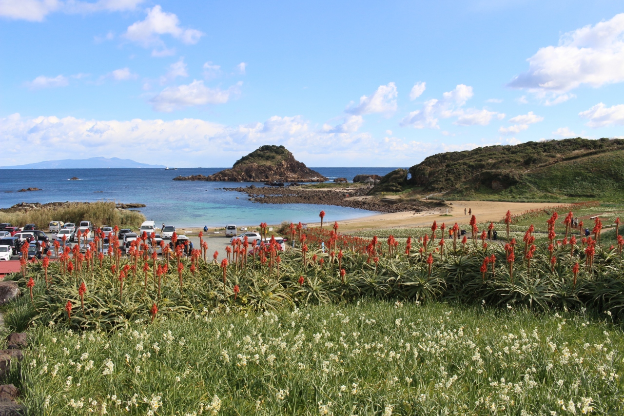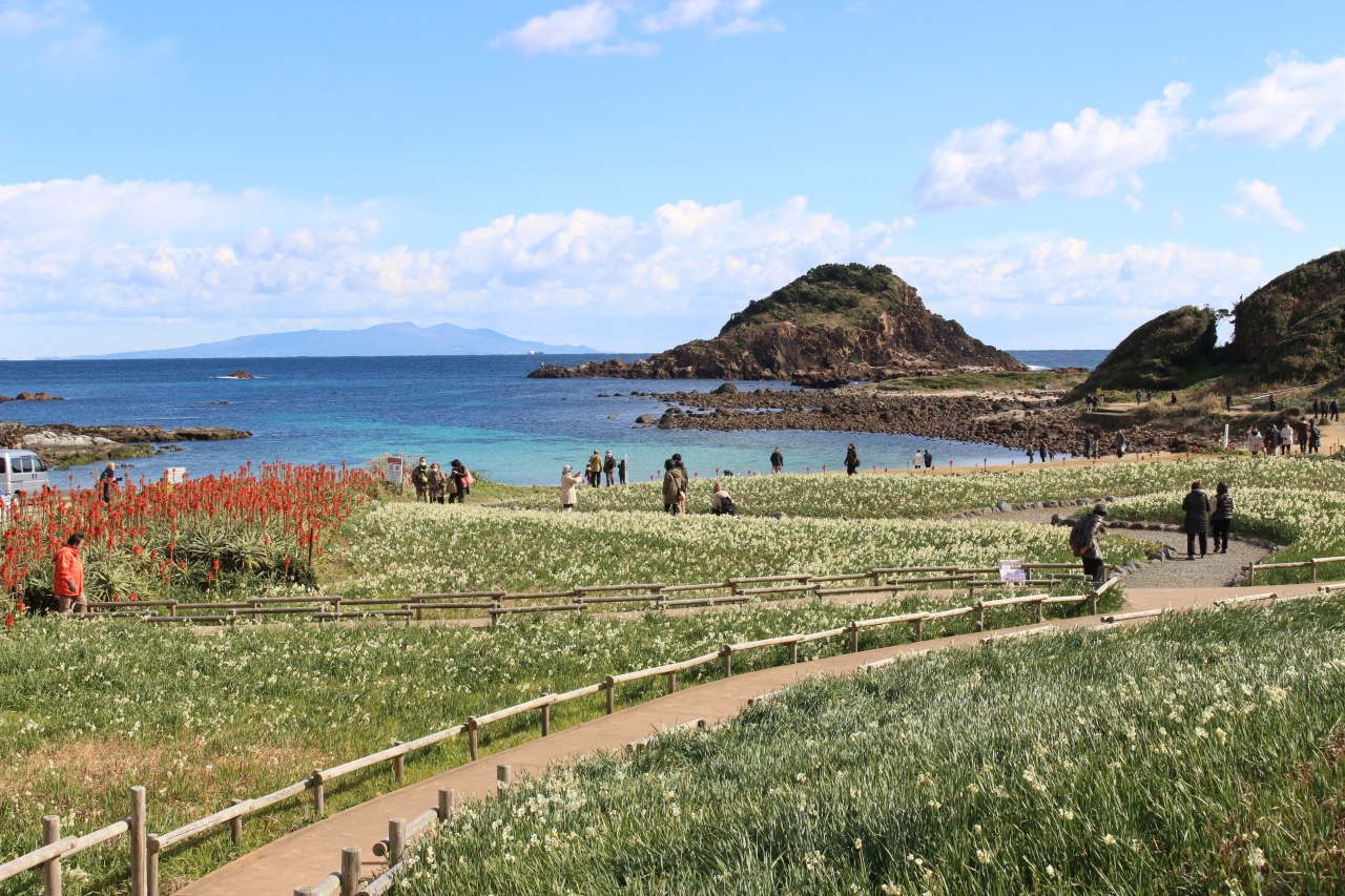 1年前にJRのポスターで見て、行ってみたいと思ってました。気づいた時には、すでに見頃を過ぎていたため、今年は以下のページで開花情報などを見て、タイミングを図っていきましたが、斜面の野水仙はすでに強風で倒れているのが多かったし、思ったほど規模も大きくなかったですが、周囲の海がきれいで、全体的な風景はよかったです。