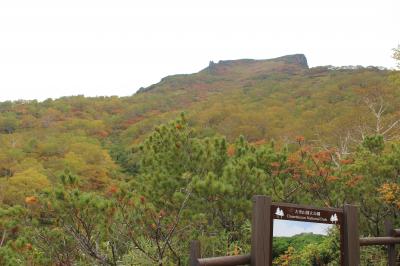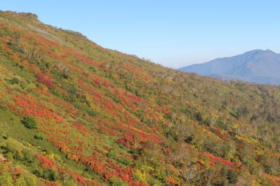 臨時駐車場でシャトルバスに乗り換え、登山道を20分くらい歩くと、視界が開け山の斜面の紅葉が見えてきます。