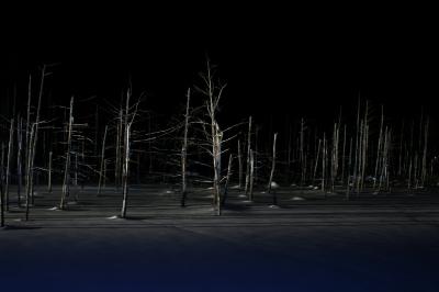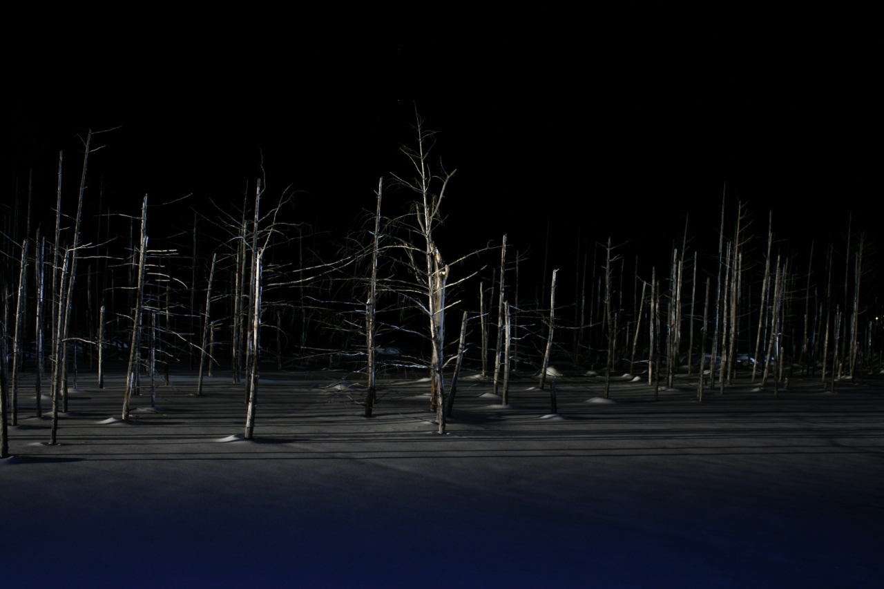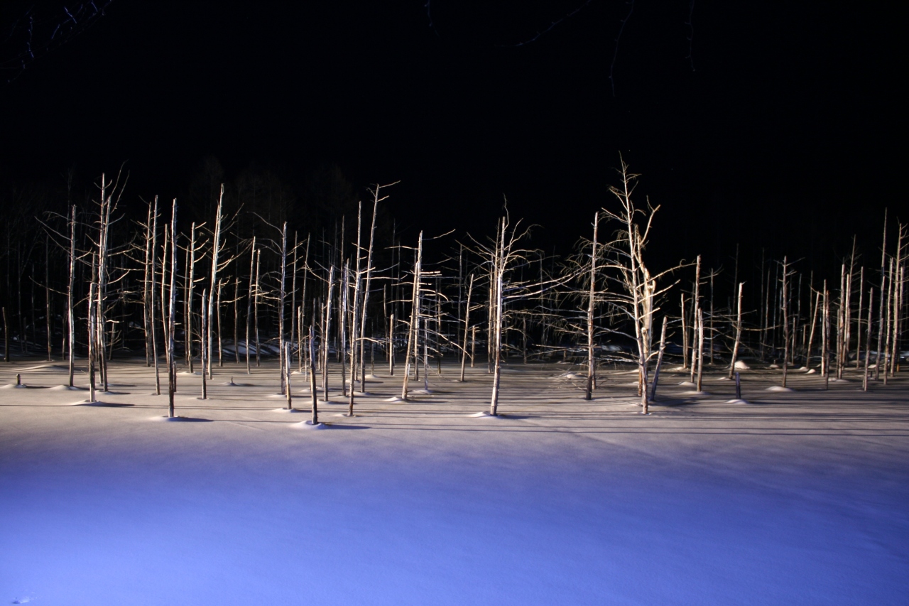 昼間にも行きましたが、冬季は雪で覆われているいるので、青くもないただの白い雪原の林となります。- 旅行時期