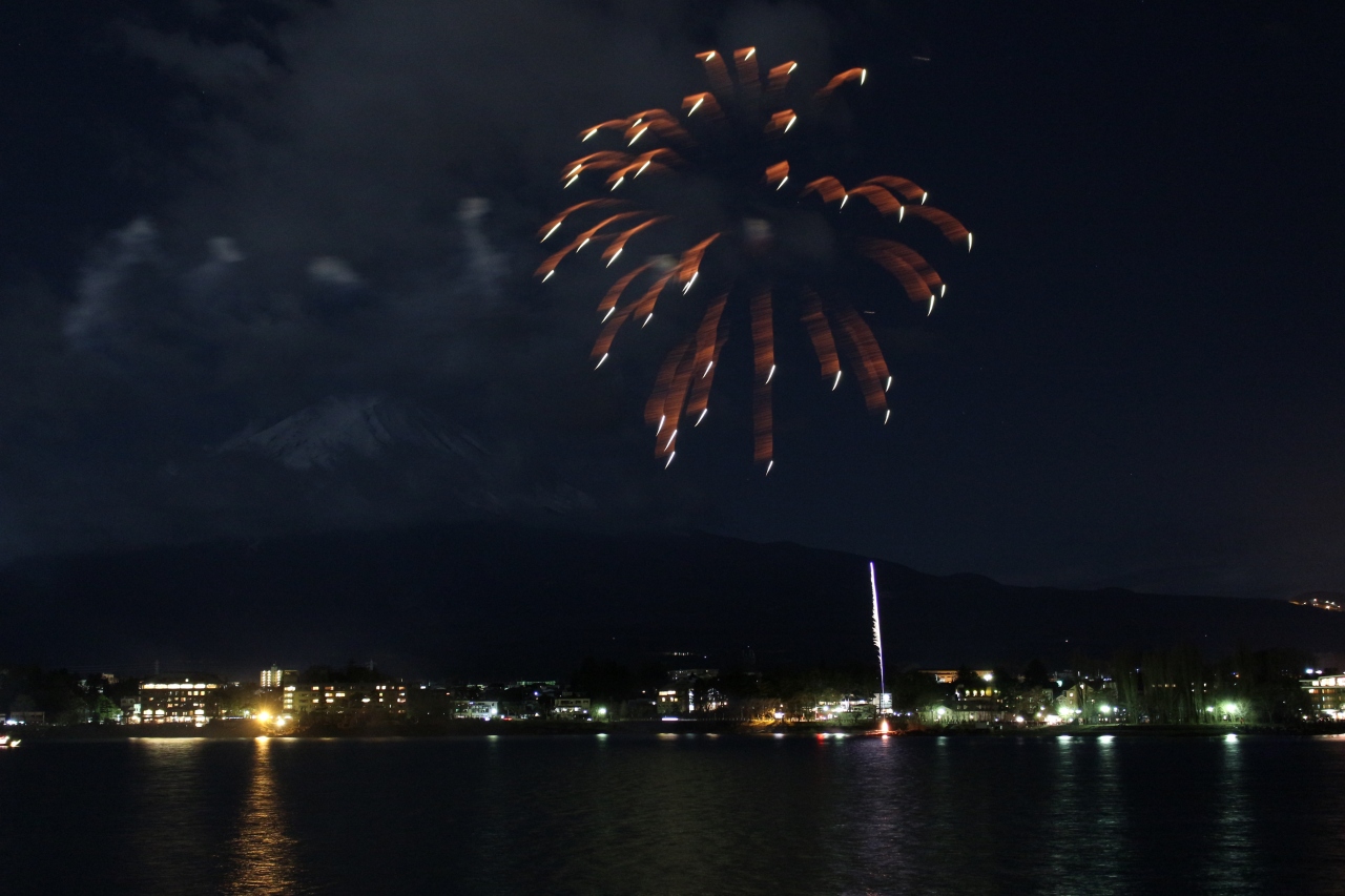 夜に浮かび上がる富士山と花火とのコラボを求めて、