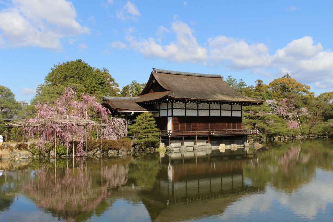 以前に平安神宮を訪問した際に、案内マップに裏手の広大な池が広がっていて桜の名所のようでした。今回桜の時期に再訪し入場しましたが、池は案内マップほどの大きさではなかったですが、その分波風が立ちにくくきれいな映り込みの風景を見ることができました。