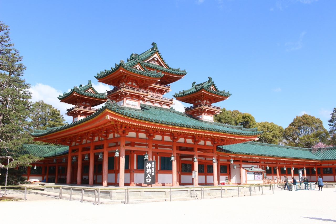 京都の観光名所は、なんとなく、こまこましいというか密集した建物群が多く、広い空の下の開けた所というのは少ない感じがします。ただ平安神宮は広い敷地に余裕を持って建築物が建てられており、朱色の建物の景色がとても新鮮でした。