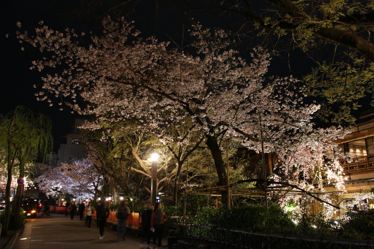 白川沿いの桜が一部ライトアップされていました。川は小さく、それにかかる橋も小さいので、結構な人混みで、どちらかというと外国人の方が多いようでした。- 旅行時期