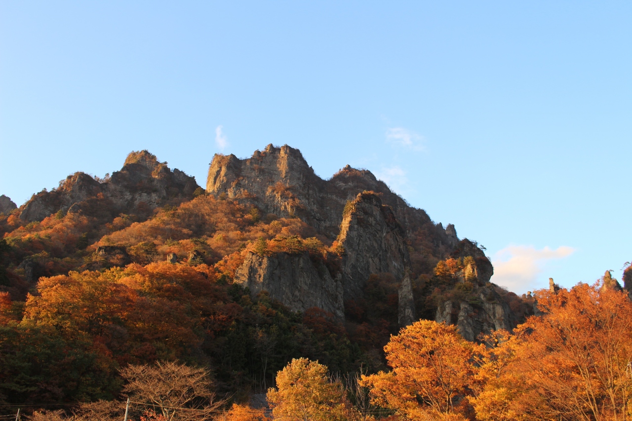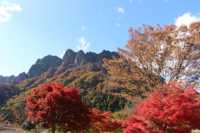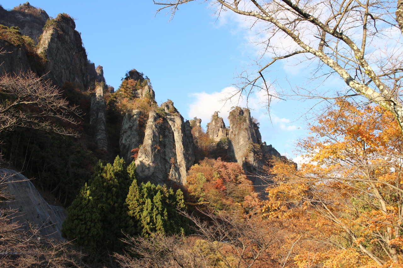 紅葉の終盤、妙義山の紅葉を見に行きました。山の紅葉はかなり終わりかけでしたが、それでも特異な山容は圧倒するものがあり、紅葉のきれいな時に是非再訪したいと思いました。妙義山パノラマパークからさらに道沿いに西へ車を走らせると、トイレのある広い駐車場があり、見事な山並を間近で見ることができます。