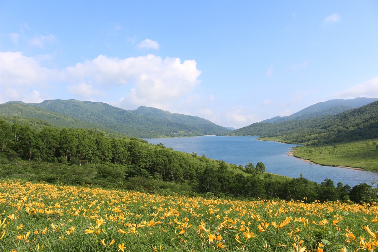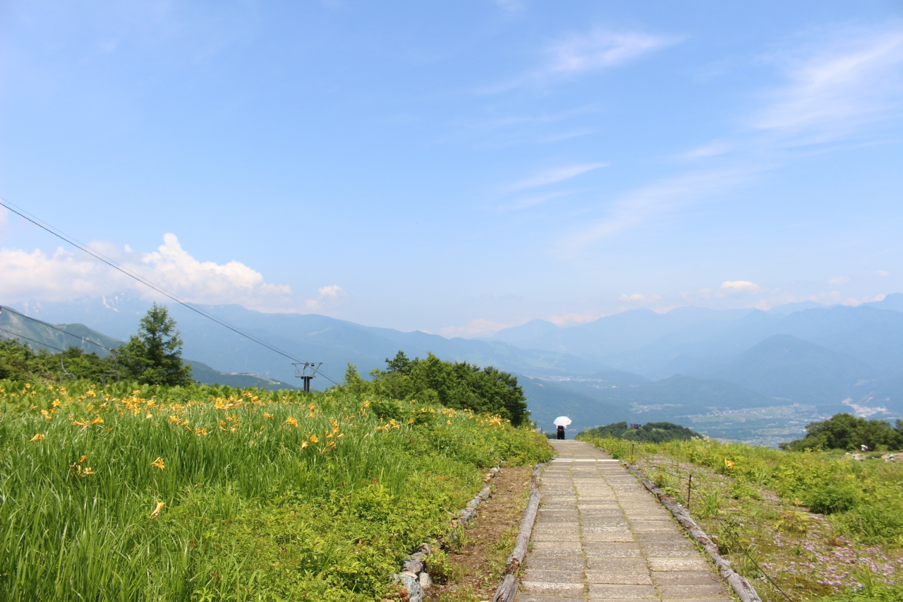 五竜高山植物園のあるアルプス平から更に上のほうに向かっていくと上のリフト乗場にたどりつき、周回できる遊歩道があります。少し登りがきつかったりしますが、道沿いからアルプスの山並みがきれいに見えたり、キスゲが咲いていたりと、すばらしい景色でした。