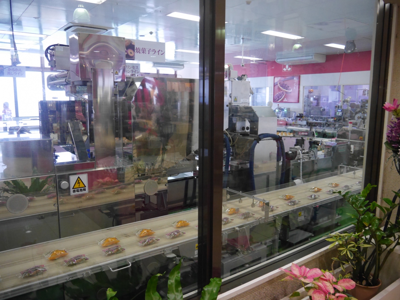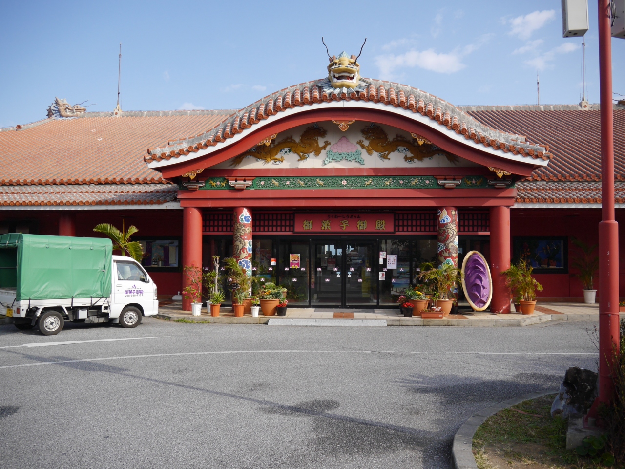 朱色の瓦屋根に沖縄らしい造りで、まるで首里城を思わせる店構えをしています。広い店内には元祖紅いもタルトをはじめ、沖縄の代表土産ちんすこうやサーターアンダギーの他、パイ菓子やカルカンなど種類豊富に揃えられていました。又、お菓子の製造ラインをガラス越しに見学することもできました。