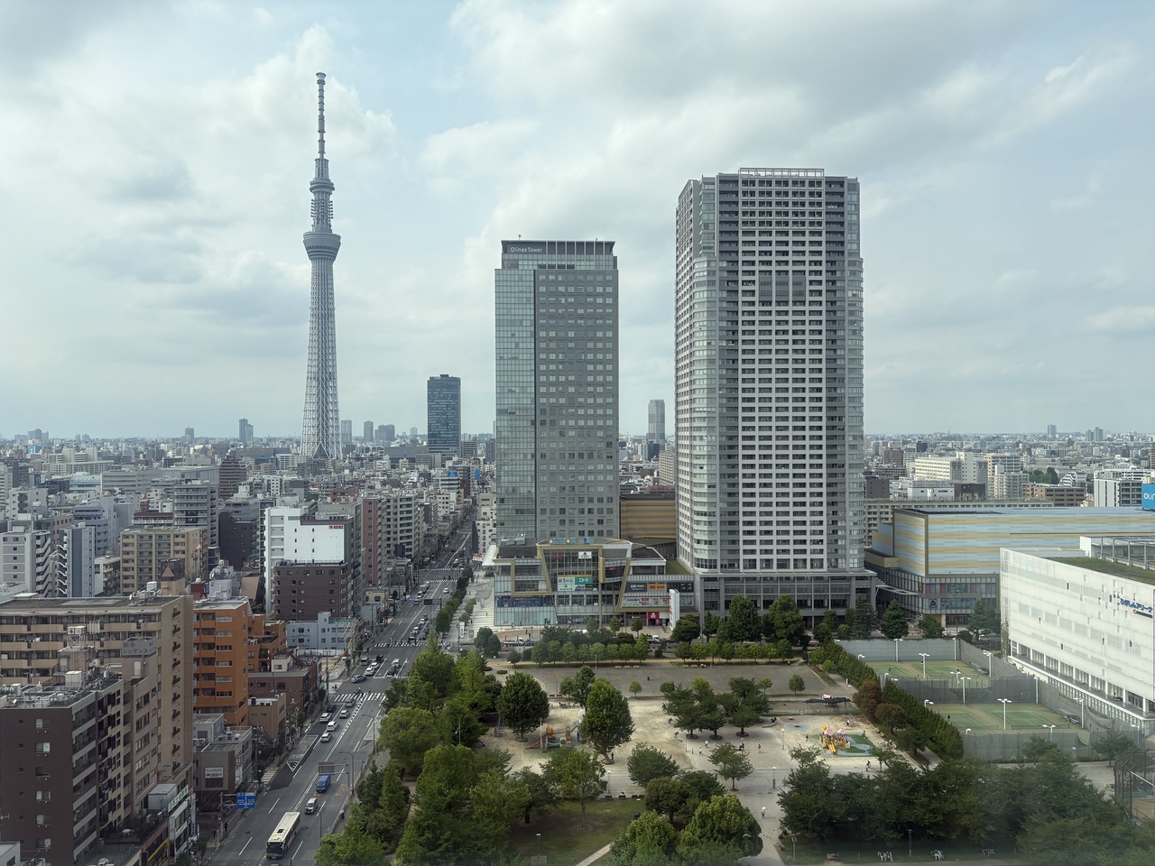 お部屋に入ると、窓の向こうにはスカイツリー、窓の下には錦糸公園。