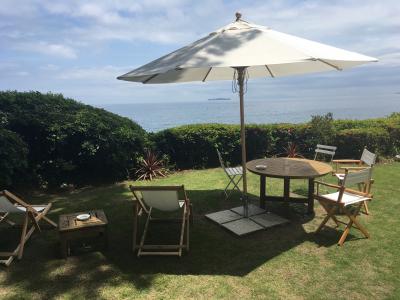 湯上り後には青梅テラスで相模湾を望みながら涼み、おいしいお酒やお饅頭をいただきゆっくりとした時間に浸りました。