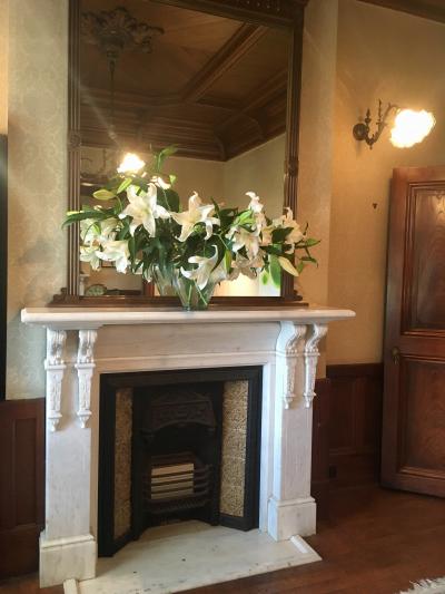 玄関上部欄間と階段室天井にはステンドグラスが嵌め込まれ、サロンの暖炉は大理石を用いられ、こだわりが感じられました。