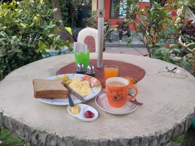 レイクサイド2Bの角から50mくらい奥にあります。オーナーのSURYAさんは長年日本に住んでいたそうで日本語に堪能です。なのでいろいろ相談事にのってもらえるし、GHの専用車でツアーもアレンジしてもらえます。朝食はセットメニューですが花いっぱいの中庭でいただけます。中々優雅ですよ。グアバとか胡椒とか色々説明してくれたけど忘れました。