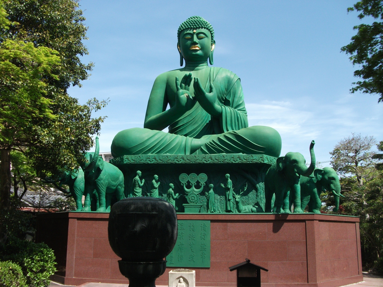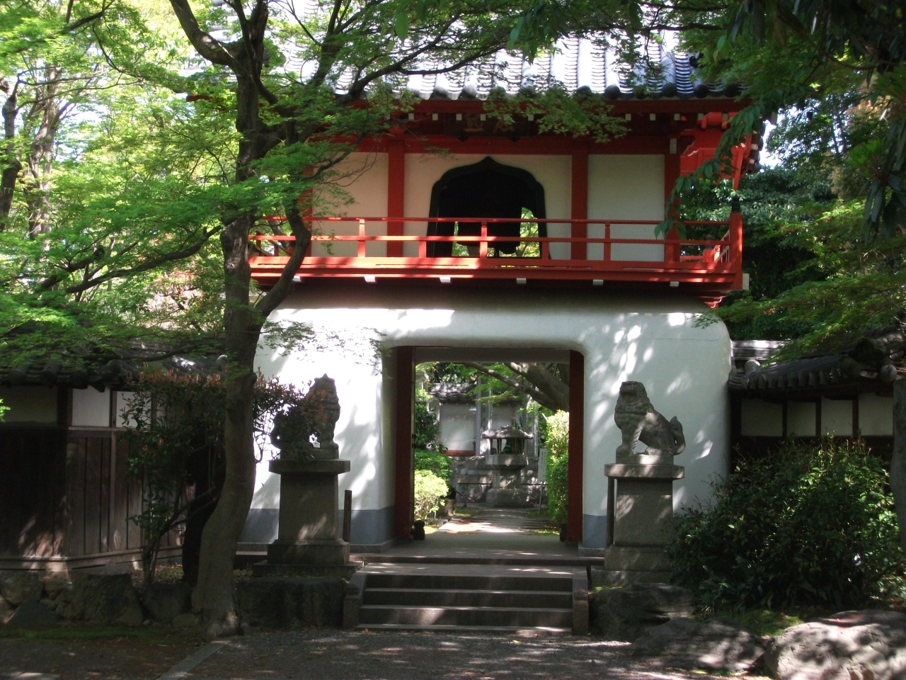 四谷通り側から入って40m位で参道は直角で左に曲がっています。すると目の前に竜宮門形式の山門が現れます。緑の中に山門の朱が鮮やかです。更にその先を左に回ると本堂になります。右に行って階段を降りると大仏さんがご鎮座しています。全身緑色で唇などが金色に塗られています。場所はお寺の崖下で反対側は墓地に囲まれています。夕方一人で来るとちょっと心細い気になるかも。でも、緑が多く気持ちのいいお寺です。- 旅行時期