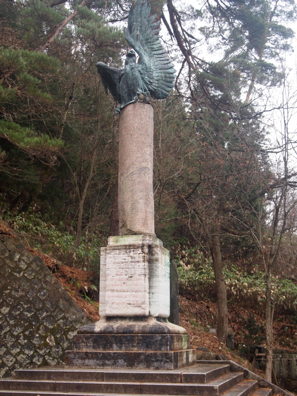 荒城の月は土井晩翠作詞・瀧廉太郎作曲の皆さんおなじみの歌曲です。土井晩翠が詞を構想したのは会津若松の鶴ヶ城の他に宮城県仙台市の青葉城址、岩手県二戸市の九戸城址、そして瀧廉太郎が曲を構想したとされるのが大分県竹田市の岡城址、と富山県の富山城でそれぞれ歌碑が設置されているそうです。この曲ができた当時の鶴ヶ城は明治政府によりすべての建物が取り壊されて石垣のみの状態でいかにも荒城といった雰囲気だったかもしれません。本丸郭内を散策するうち土塁の袂にポツンと碑が建っているのを見つけました。天守閣とは反対側の月見櫓址のチョットうら淋しいような場所なので曲のイメージ通りの雰囲気でした。