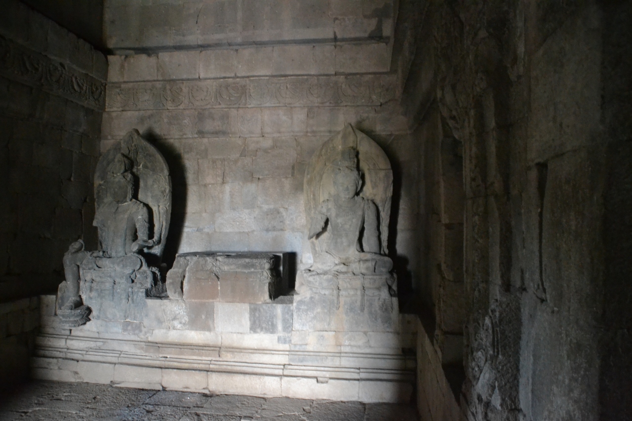 北は二つの主堂があって何れも仏像が安置してあるんですけど三尊像のメインがいません。よくわかりませんけど盗まれたか、貴重なのでどこかの博物館に保管してあるのか定かではありません。周囲の無数の小祠堂は崩壊したまま。入り口に小屋があるけど入場料は掲示してありません。無料かと思うと中のおじさんが10000IDR(82円)といいます。多分ドネーションなんでしょう。