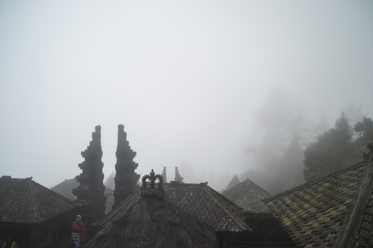 お茶畑の中の山道を行くと終点突当りの丘の上に割れ門が見えてきました。入り口の小屋で入場料を払い腰布を巻いてもらいます。山の斜面に造られているので本殿に向かって段々登っていく形になります。境内はきれいに整備されているので公園のような雰囲気もあります。途中、トイレがありますけどちゃんと清掃されているので、私的には問題ありませんでした。本殿へ行く途中、ひょうきんでユーモラスな像やレリーフが迎えてくれます。本殿まで行くと荘厳な雰囲気に変わります。標高が高いようで霧に包まれると近くの建物しか見えなくなり、更に雰囲気が高まります。