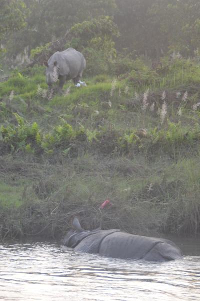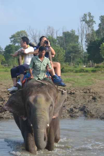 カトマンズ~チトワン~ポカラの2泊3日ツアーに参加しました。バスパークに着くとのお迎えの車でホテルへ。夕方、ガイドに連れられて徒歩で川へサンセットを見にいくことに。川まではホテルから30分くらい。川に沿って歩くとサイのカップルが水浴び中。我々とサイの間には柵もありません。2日目はジャングルウオーク、エレファントサファリ、タルーダンスなど。料金はホテルのランクによって差があるだけで、ツアーの内容は一緒です。夜になっても不快な虫は全くいないので虫除けなどは不要でした。