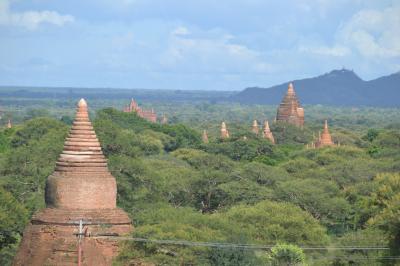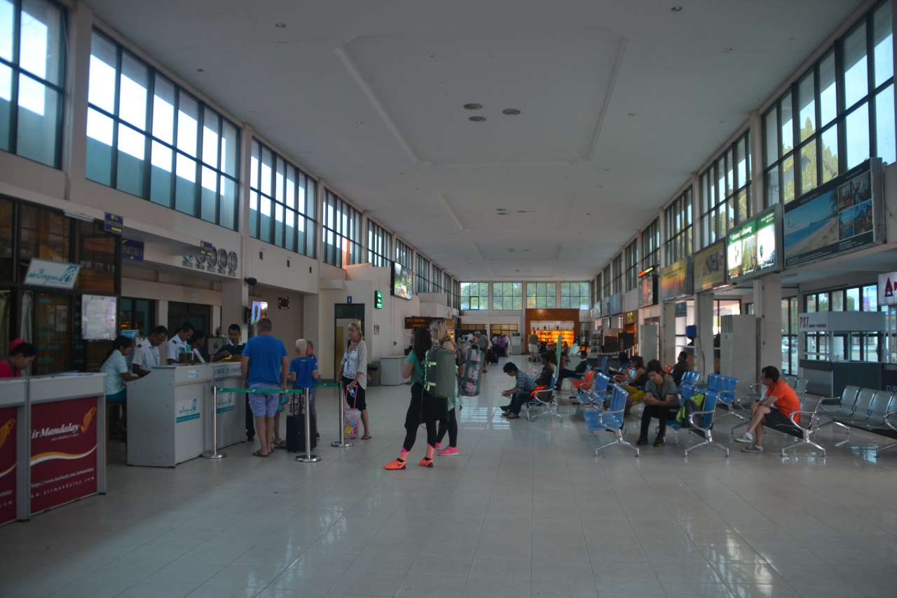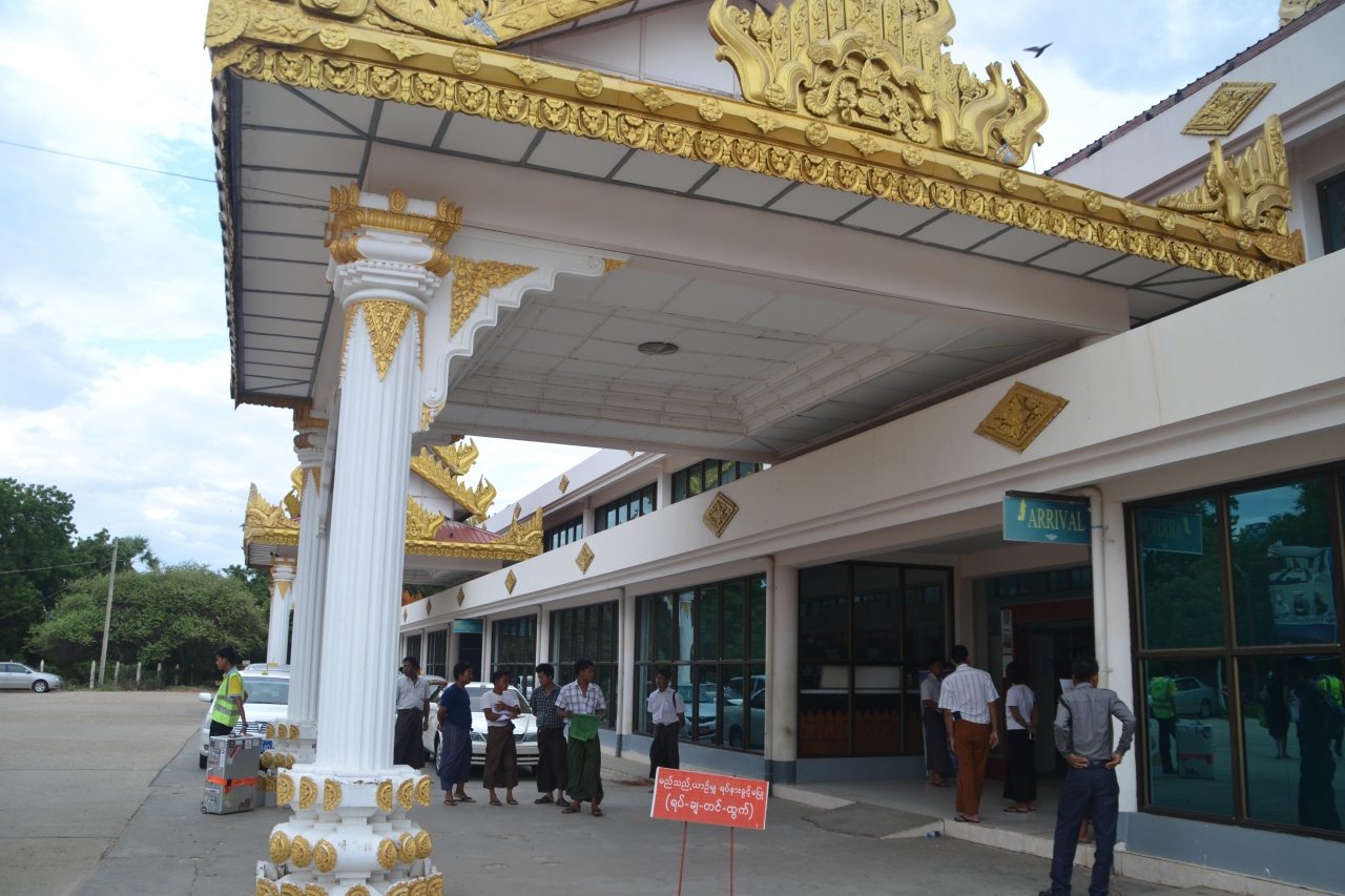 マンダレーから到着。飛行機はすべて沖止めです。飛行機を降りたらバスでターミナルビルへ。でも、歩いたほうが早い。ビルに入ったところで待っていると荷物は手押し車でもって来てくれます。外に出る前のカウンターでバガン入域料が半ば強制的に徴収されます。