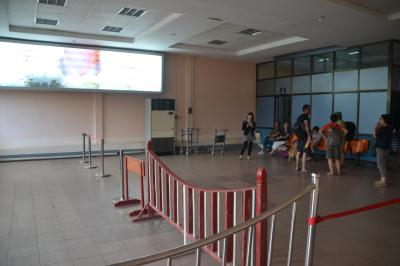 出発はチェックイン後ベンチに座っていると、保安検査の上搭乗待合室へ行くよう係員に促されます。暫く待っていると係員が航空会社名と便名を書いたプラカードを持って怒鳴ります。その後、到着時と逆にバスに乗って飛行機へ。