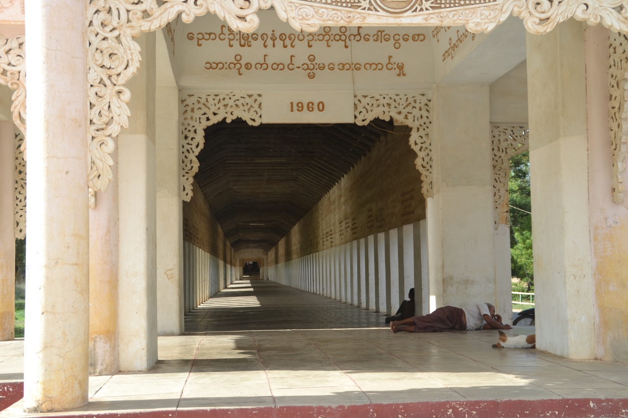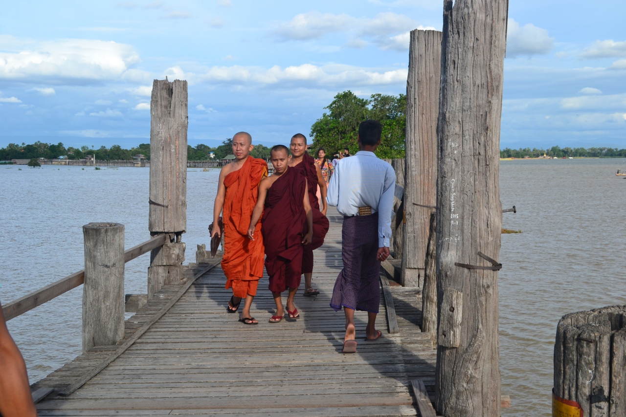 マンダレーからバイクタクシーで行きました。橋のたもとには多くの土産物屋と観光客。外国人よりミャンマー人が圧倒的に多い印象です。全長1.2キロの橋をぶらぶら歩きながら、途中途中の休憩所で果物を買って食べながら行きました。行きかう人たちは皆楽しそう。向こう岸の茶店(海の家みたいなところ)で時間をつぶし日没を待ちました。夕方だったので湖を渡る風が心地よく、日本では得られないゆったりした時を過ごすことができました。