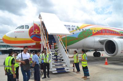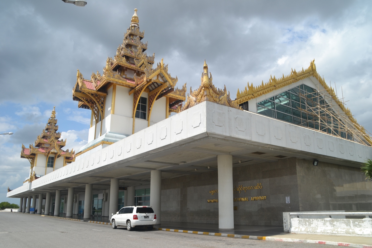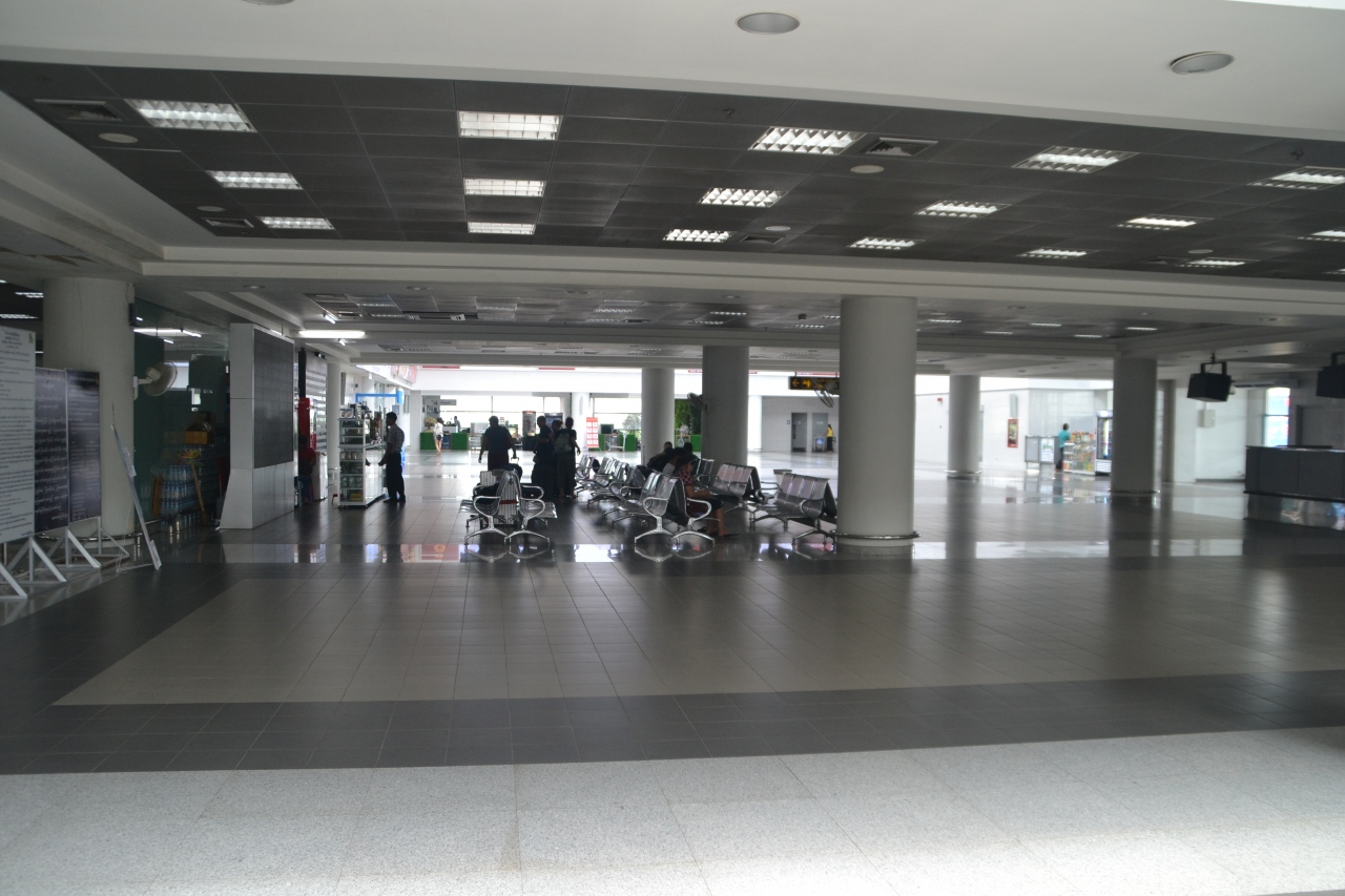 バンコクから到着。入管・税関を済ませて出たところは1階ロビー。薄暗くて喫茶コーナーx2、売店x1、両替所x3の以上です。出発は2階なのでスーツケースを持って階段を上がらなければなりません。2階ロビーも薄暗く数人の旅行客がいるだけです。国内線と国際線の2か所入口があって、そこを入ればチェックインカウンターがあります。搭乗待合室は国際・国内の2か所。ボーディングブリッジは6か所ありましたけど使われていません。飛行機は沖止めです。まごつくばかりの飛行場ですけど、終わってみれば印象に残る空港です。