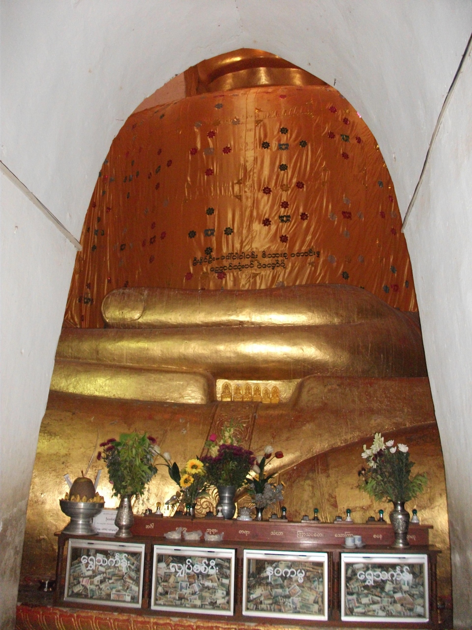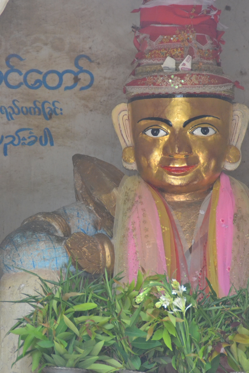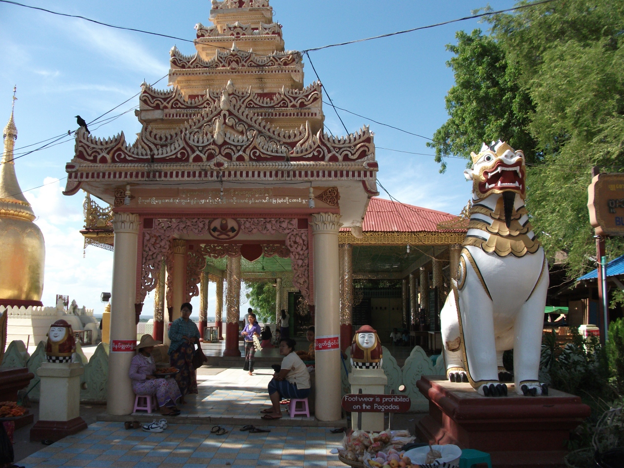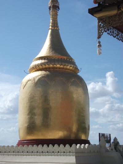 この寺院の特徴は、長い参道とその先にある黄金に輝くパゴダです。三層の基壇とその上に載るパゴダはビルマ様式の寺院の原型とも言われています。参道には土産物を売る店が何軒かあります。私たちの乗った車のドライバーは高いからここでは買うなと言ってました。パゴダは近くで見ると全体に金色が薄くなって、そろそろ再塗装の時期かと。でもその壮麗さには感動を覚えます。
