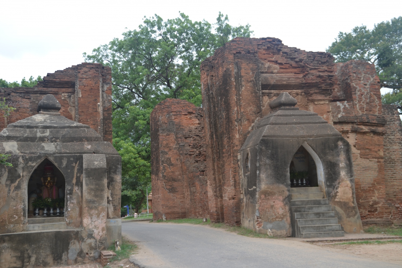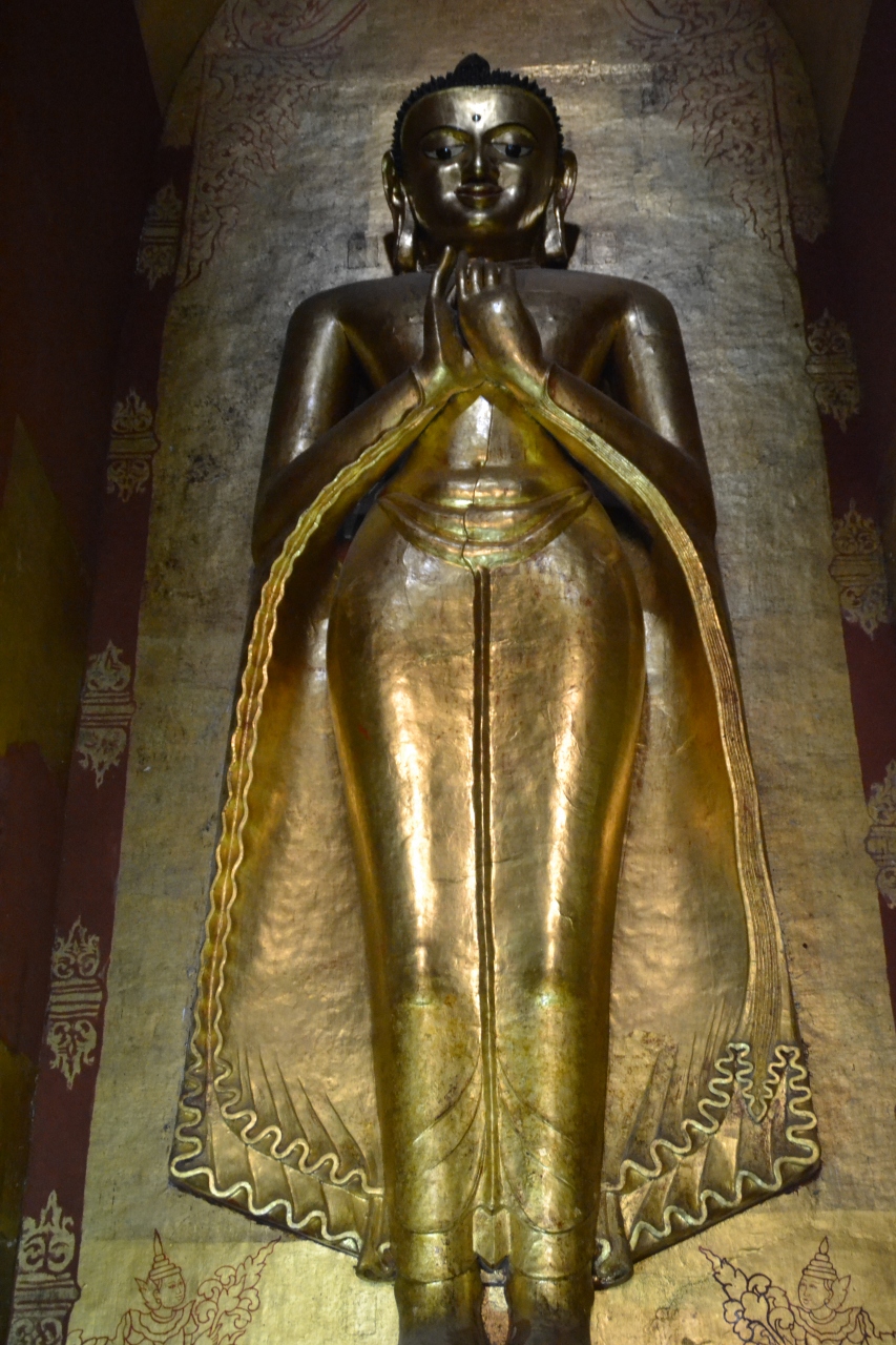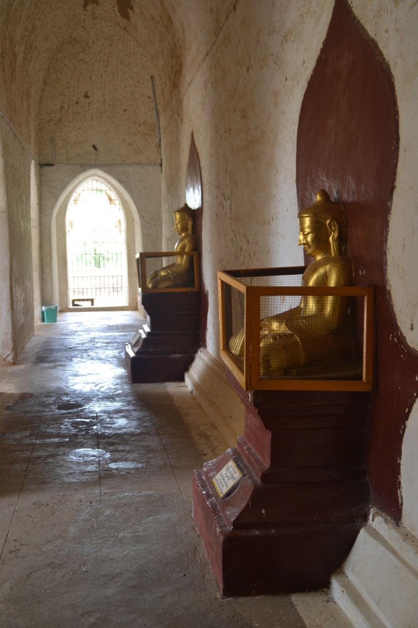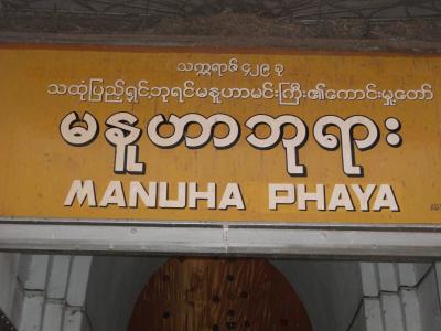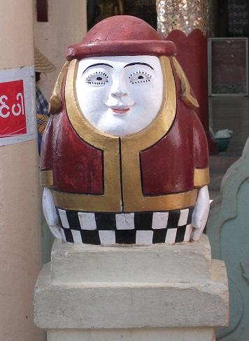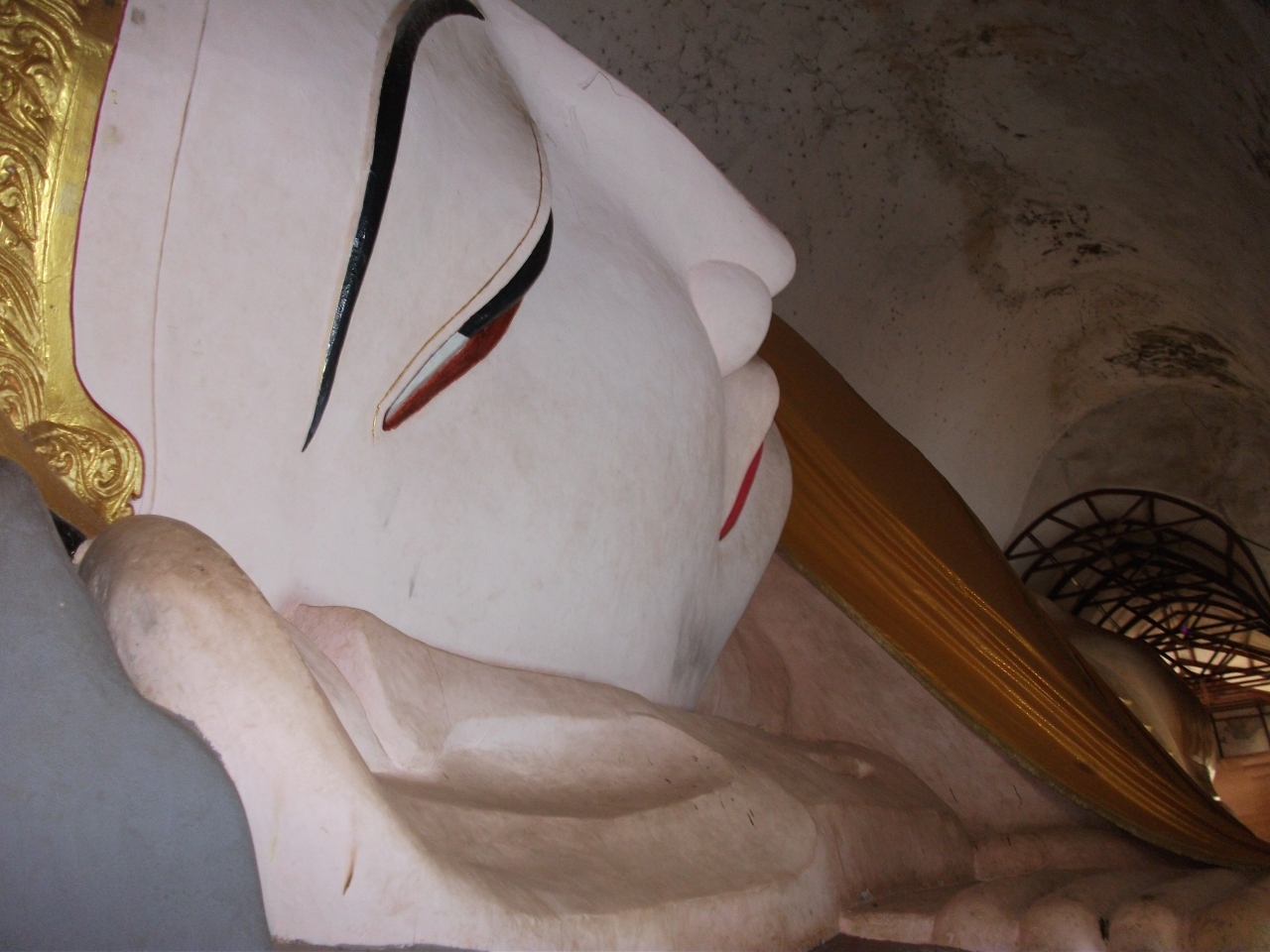 この寺院の特徴は、長い参道とその先にある黄金に輝くパゴダです。三層の基壇とその上に載るパゴダはビルマ様式の寺院の原型とも言われています。参道には土産物を売る店が何軒かあります。私たちの乗った車のドライバーは高いからここでは買うなと言ってました。パゴダは近くで見ると全体に金色が薄くなって、そろそろ再塗装の時期かと。でもその壮麗さには感動を覚えます。