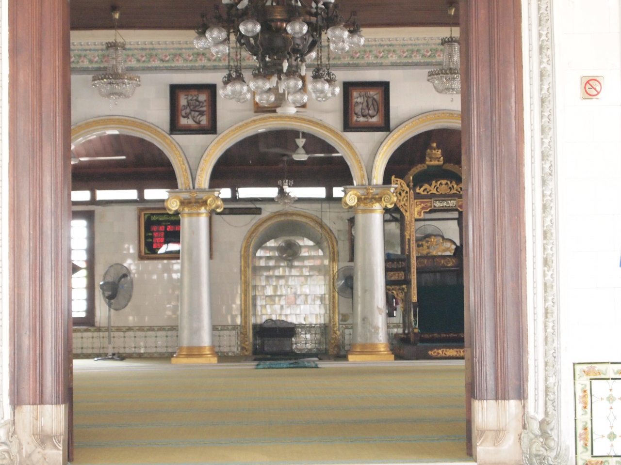 チェンフーテン寺院から100mくらいのところにあります。このあたりは仏教・回教・ヒンドゥー教寺院が仲良く点在しています。規模はそんなに大きくなく、礼拝を呼びかけるミナレットが立っているので回教寺院と判るくらいです。この宗教の寺院には礼拝の対象となるものは無いので、礼拝時間以外は閑散としたものです。私たちが訪れた時も全く人影は無ありませんでしたが、厳粛な雰囲気だけは感じることができました。